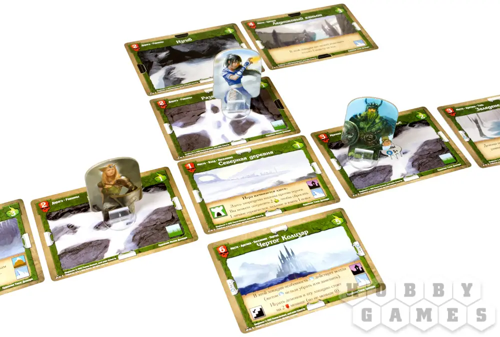 фаза локаций — вы вытаскиваете одну карту локаций и формируете мир, по которому сможете передвигаться;