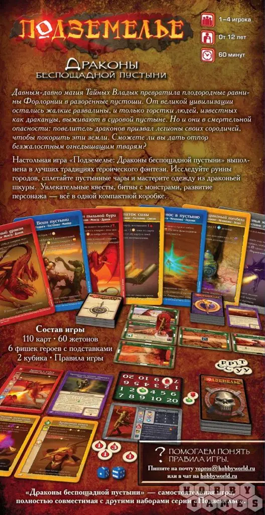 "Подземелье: Драконы беспощадной пустыни" – это новая самостоятельная игра в серии "Подземелье", которую, однако, можно совмещать и с другими играми серии. Вас ждёт совершенно новое путешествие и, возможно, самое опасное из всех, что вы уже пережили.