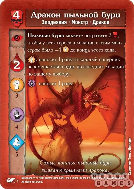 Фаза злодеяний – в эту фазу игрок действует в роли повелителя драконов и может потратить очки риска, накопленные другими игроками, для того, чтобы разыграть на игроков карты проклятий или столкновений с монстрами
