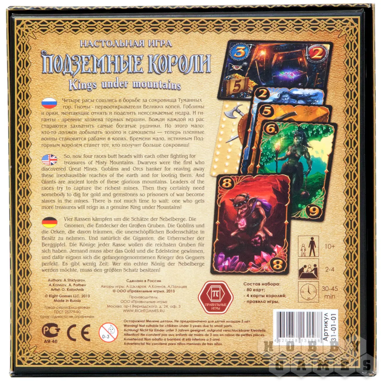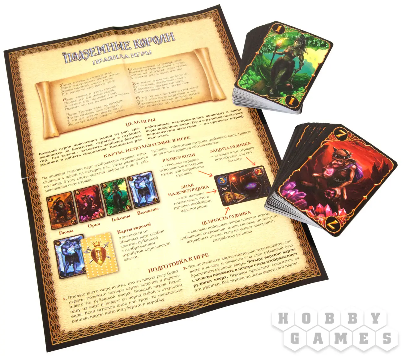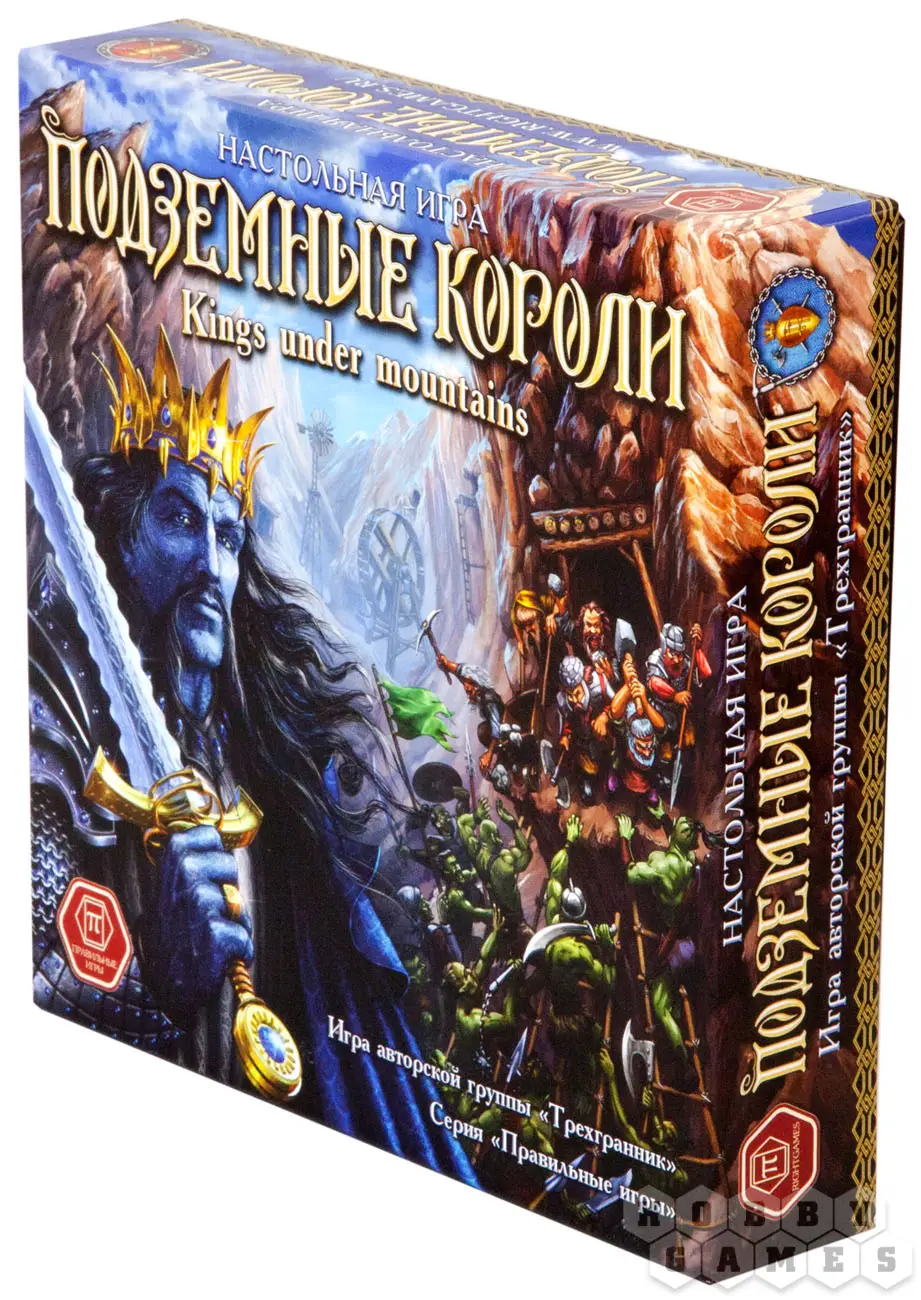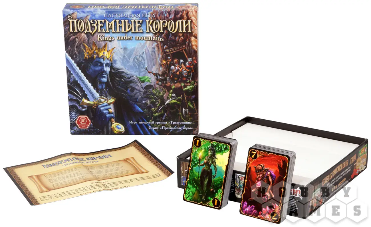 «Подземные короли» - это настольная фэнтезийная игра. Цель каждого из игроков – захватить шахты, богатые золотом и драгоценностями, а затем наполнить их пленными шахтерами. На выбор предоставлены четыре расы: великаны, орки, гоблины и гномы. Игра карточная. Каждая из карт имеет на лицевой стороне изображение отряда с определенной силой (от 0 до 9), а на оборотной – рудник с цифрами его ценности, размера и защиты. То есть каждая карта может быть как рудником, так и отрядом! Для чего это сделано?