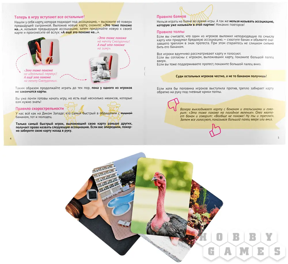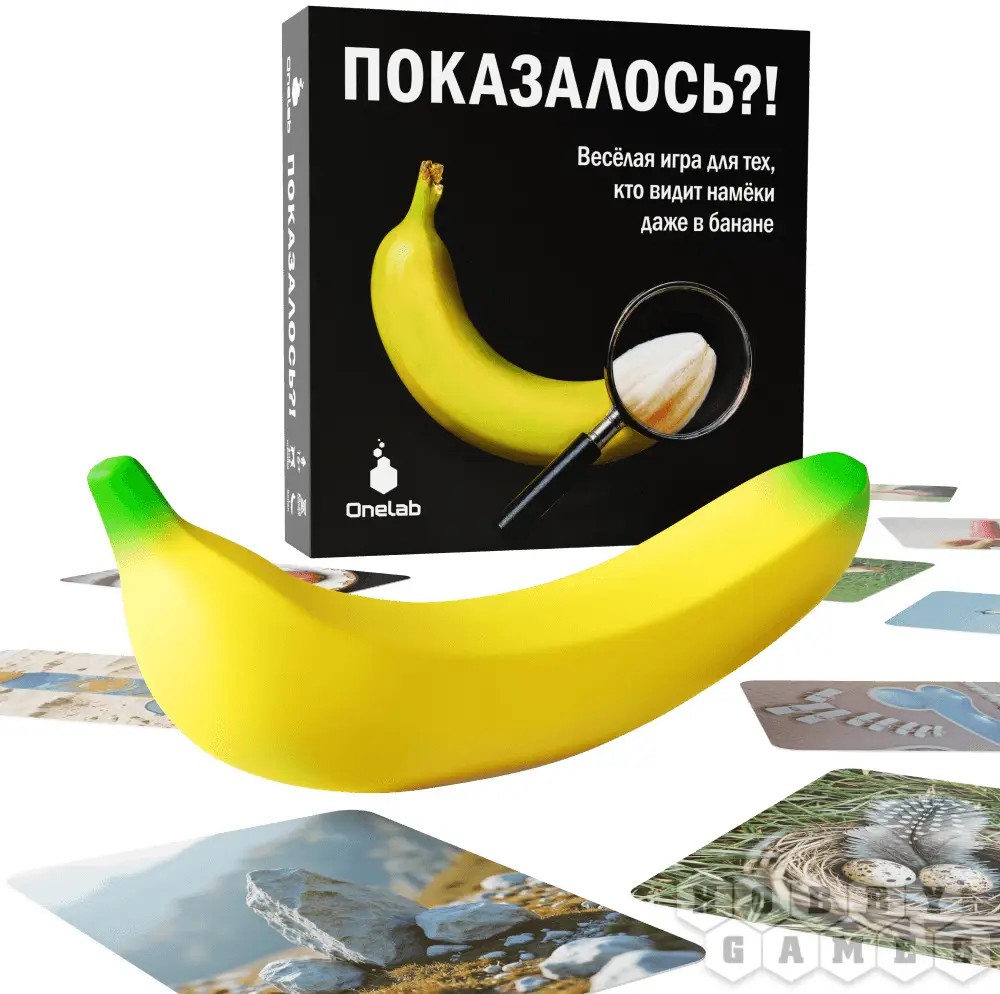 "Показалось?!" – это весёлая карточная настолка для компаний постарше, настоящий аттракцион абсурдных ассоциаций, где невинное изображение может обернуться самым неожиданным намёком. Ваша главная задача – первым избавиться от всех своих карт. Но просто скинуть их не получится: каждую карту нужно "обосновать" – озвучить смешную, неожиданную или откровенно абсурдную ассоциацию. Здесь нет правильных ответов, но будьте готовы – каждый из участников оставляет за собой право усомниться в том, что ваша реплика действительно подходит той или иной карте. Все протесты выражаются с помощью банана – главного арбитра игры, "активация" которого переводит игровой процесс в голосование, решающее судьбу спорной ассоциации. А ещё в "Показалось?!" есть особые карты-джокеры, которые могут могут перевернуть ход игры с ног на голову – например, заставить всех игроков обменяться своими картами.