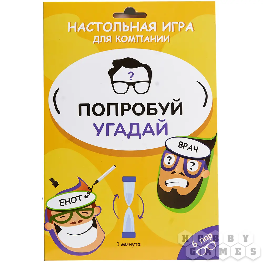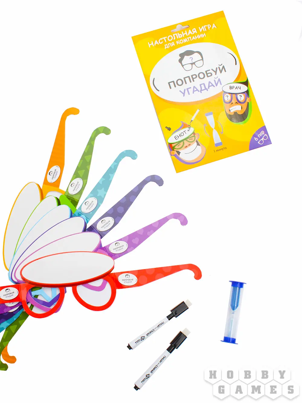 Игра, которая не надоест! Каждый раз – новый персонаж, новые эмоции. Пишите на очках с окошками имя известной личности. Игрок в очках задаёт вопросы, требующие ответа "да" или "нет" и отгадывает слово по подсказкам. В комплекте идут песочные часы, отмеряющие ровно минуту. Когда слово отгадано, его можно стереть и использовать очки снова.