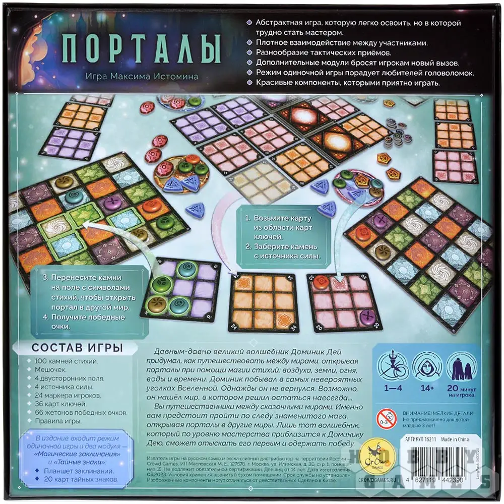Абстрактная игра "Порталы" переносит вас в мир магии и стратегии, где каждый ход – это шаг к открытию новых измерений. Вы будете собирать магические ключи, заполняя их узоры камнями стихий, а затем размещать их на общих полях, чтобы активировать порталы. Но будьте осторожны: вас стремятся опередить соперники, и чтобы захватить нужные клетки первыми, придётся прибегнуть к хитрости и расчёту! Эта игра идеально подойдёт тем, кто любит тактические головоломки и красивые компоненты – камни стихий завораживают своей минималистичным, но ярким дизайном и тактильно приятны. В коробке вас ждут дополнительные модули и увлекательный одиночный режим, где предстоит сразиться с непростой, но захватывающей логической задачей.