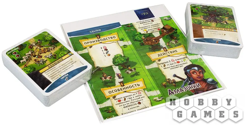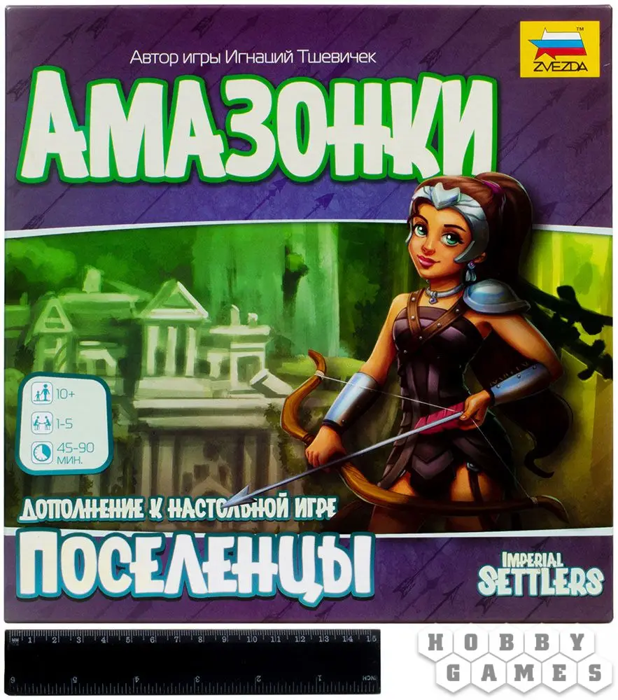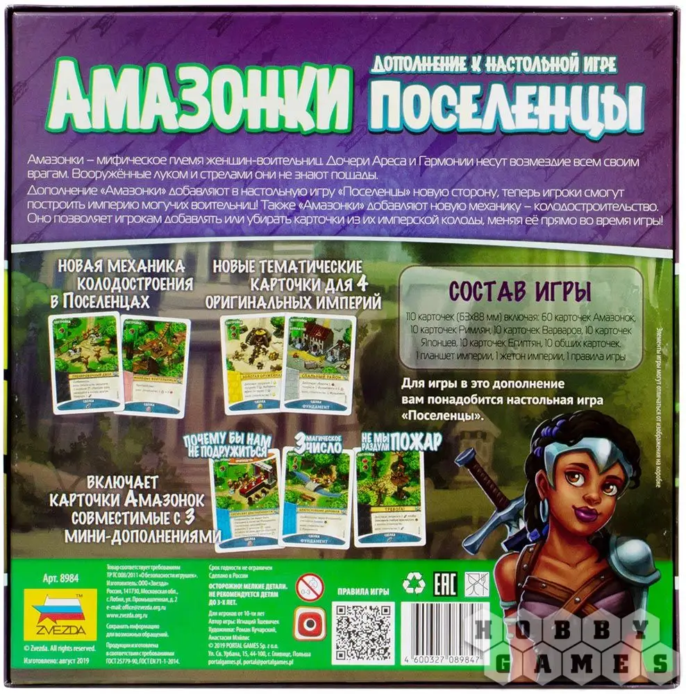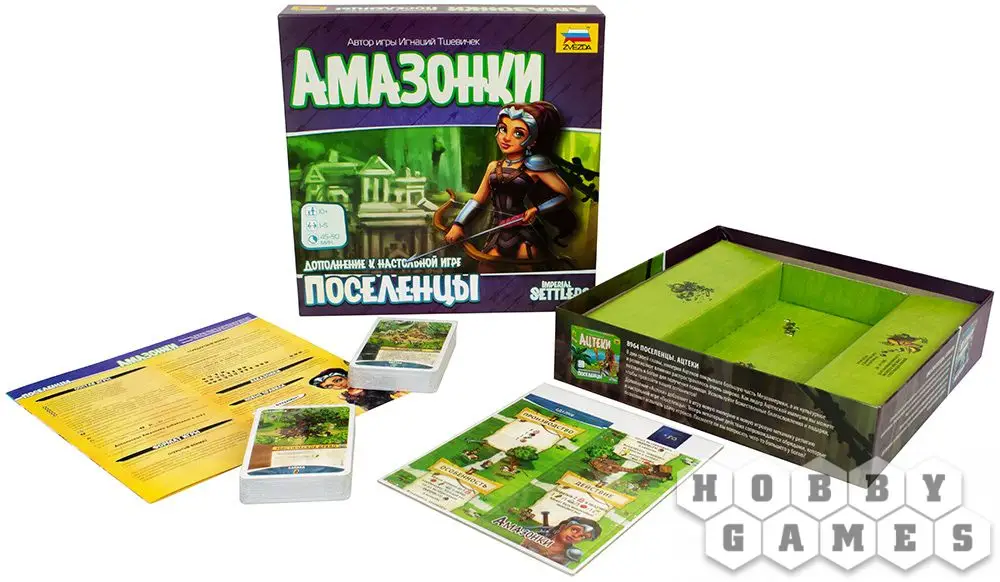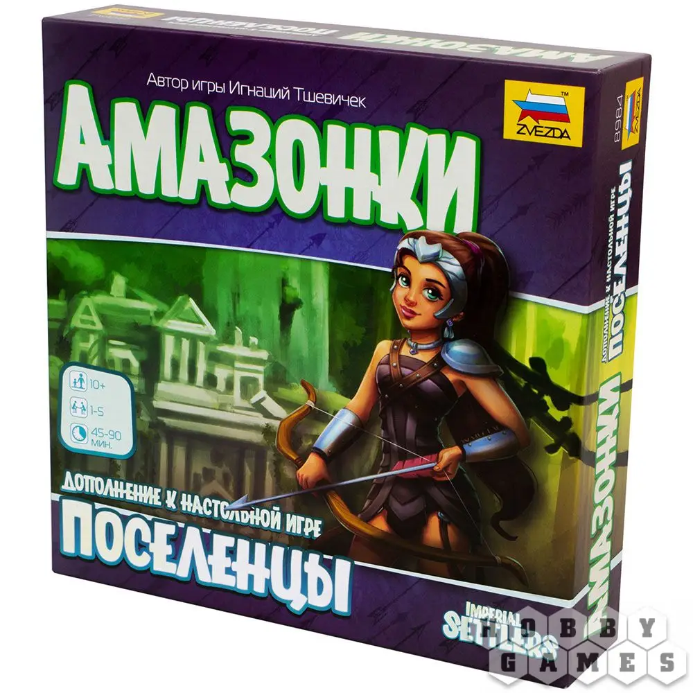 Новое дополнение "Амазонки" содержит тематические карточки для 4 оригинальных империй. Оно привносит в "Поселенцев" новую механику колодостроительства. Теперь вы сможете выставлять или убирать карточки из имперской колоды, изменяя её прямо по ходу игры. Получите полный контроль над планированием своих следующих ходов и сфокусируйтесь на ключевых картах, которые гарантируют вам наибольшее число очков для победы!