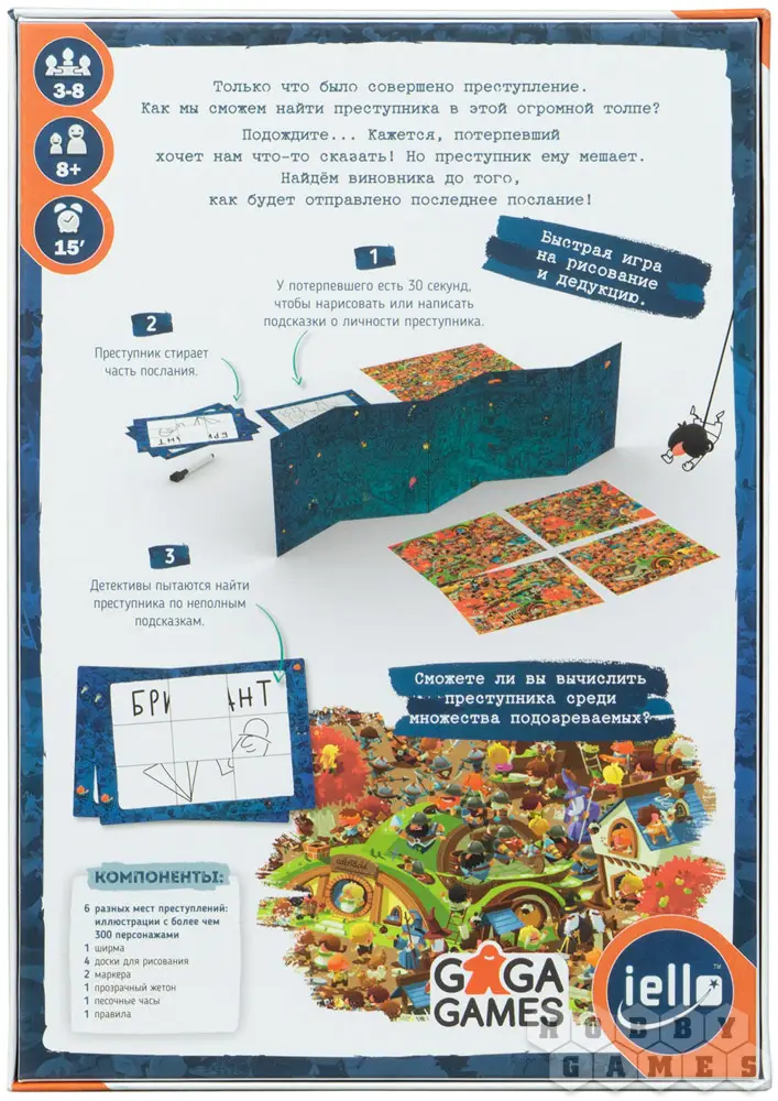 Итак, в игре присутствуют детективы, преступник и пострадавший. Последние сидят на противоположной стороне от детективов и закрываются ширмой. Перед ними лежит картинка со множеством героев, на которой преступник прозрачной фишкой отмечает одного из них – он и совершил преступление. Его личность и расположение на картинке для детективов остаётся загадкой. Потерпевший не может ничего рассказать, поэтому за 30 секунд на планшете он должен написать и/или нарисовать подсказки, которые помогут детективам отыскать загаданного персонажа на своих картинках (да, у детективов есть свои). Планшет поделён на 9 секторов, в каждом из которых можно разместить отдельную подсказку. По истечении времени, преступник забирает планшет у потерпевшего и стирает 5 подсказок, после чего передаёт его детективам. Преступник таким образом может запутывать сыщиков, оставляя только неоднозначные подсказки. Партия длится 4 раунда. В каждом следующем преступник стирает на одну подсказку меньше, так что у детективов появляется больше шансов разгадать его личность. Если в конце любого из раунда детективы раскрывают преступника, то они вместе с потерпевшим выигрывают. А если в конце четвёртого раунда детективы не смогли определить местоположение преступника, то злоумышленник остаётся безнаказанным и побеждает в игре.