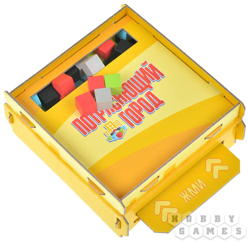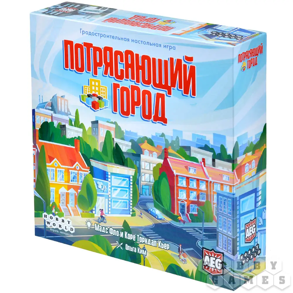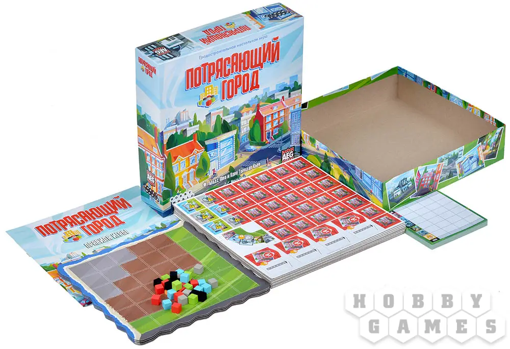 В настольной игре “Потрясающий город” каждому из игроков достаётся по кварталу, но вот загвоздка: с помощью специальной кубомешалки жетоны построек выпадают каждому игроку наугад. Сможете ли вы застроить квартал так, чтобы жители вашего города были счастливы? Побеждает игрок с самым удачным проектом!