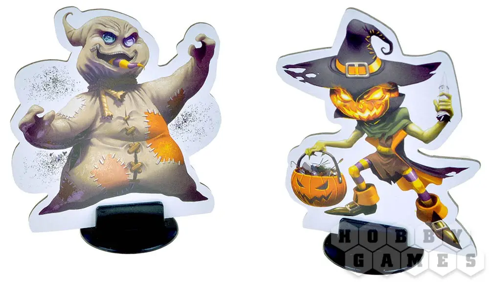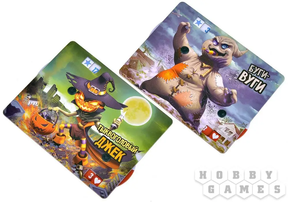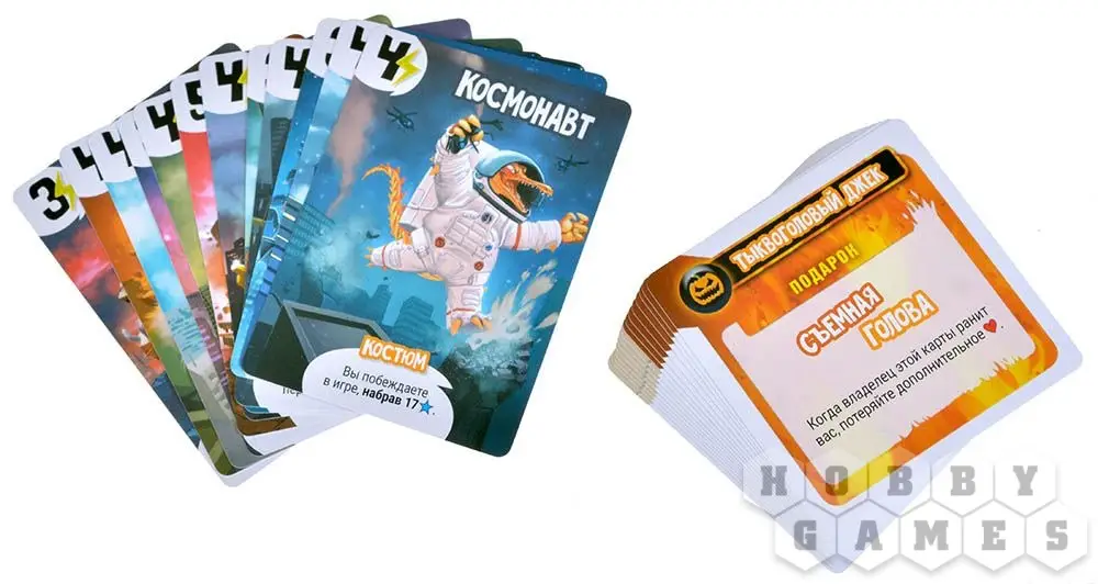 Дополнение "Хэллоуин" содержит дополнительный набор тыквенно-рыжих кубиков – можете заменить ими оригинальные, чтобы соответствовать атмосфере мрачного праздника, или использовать сразу оба, чтобы игрокам было удобнее. Также внутри вы найдёте целый набор карт костюмов – каждый из них даёт дополнительные особенности своему владельцу. В процессе игры костюмы можно будет брать напрокат у оппонентов (разумеется, за энергию) и даже надевать поверх своего!