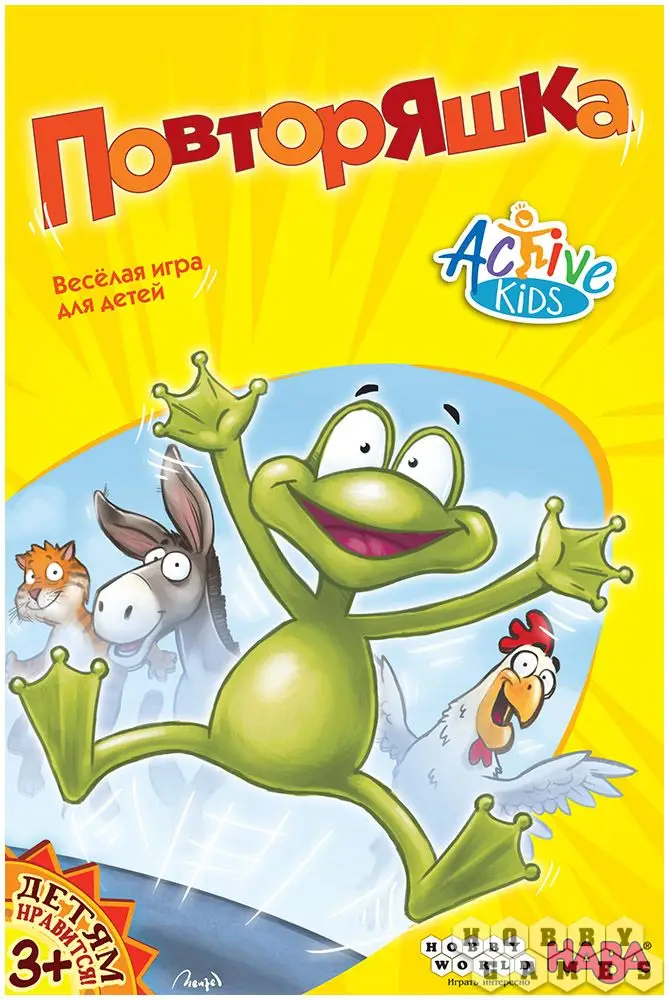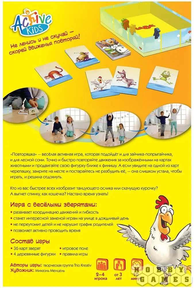 "Повторяшка" – быстрая, весёлая и задорная игра для детей, в которой игрокам предстоит много двигаться и повторять движения различных животных. Игра хоть и настольная, но играть в неё лучше на полу, нужно место для простора. Выпала карточка кошечки – значит, нужно прогнуть спинку и помяукать, выпала курочка – кукарекаем и делаем вид, что летим. Каждое движение показано на карточках и побеждает в раунде тот, у кого получилось самое убедительно изображение животного.
