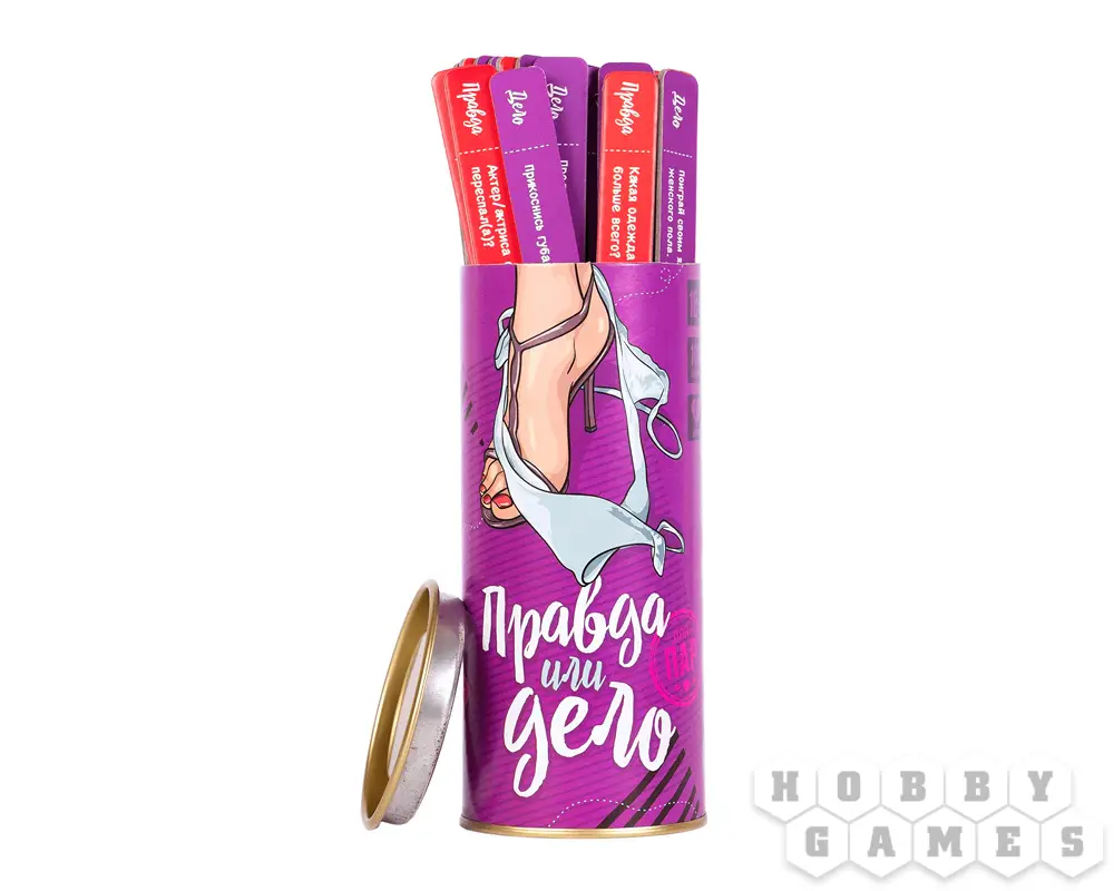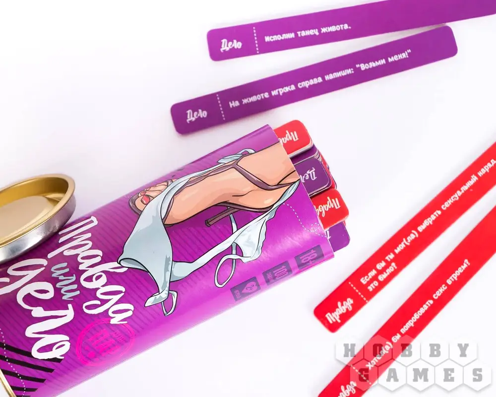 Правила игры до того просты, что, можно сказать, нет никаких правил. Вы по очереди спрашиваете другу у друга: «Правда или дело?» Если ваш партнер выбрал «правду» - он/она тянет из тубуса стик и отвечает на вопрос с красной стороны, например: «Если бы ты мог(ла) выбрать сексуальный наряд, что бы это было?». Если выбрал «дело» - тянет стик и выполняет задание, указанное на фиолетовой стороне стика, например: «Исполни танец живота».