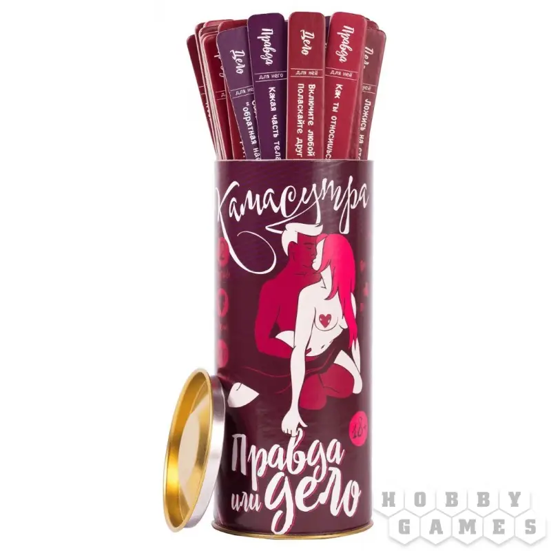 2 типа заданий настольной игры Правда или дело: Камасутра, как и в других играх этой серии, разделяются на правду и действие. Пятьдесят яркий стиков, скрывающиеся в коробке, будут задавать Вам очень откровенные вопросы, на которые обязательно и беспрекословно нужно отвечать с предельной четностью. В ходе игры выясняются весьма неожиданные вещи. Наверняка, каждому из партнеров заманчивым представляется узнать, какие фантазии преследуют ее парня, или его девушку. И, кто знает, возможно скоро ответы на все каверзные вопросы игры придется испробовать в практике, перейдя к «делу».