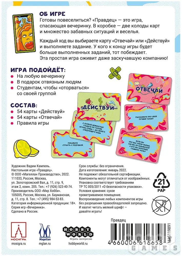 Правила вечериночной настолки "Правдец" крайне просты – каждый игрок в свой ход выбирает одну из колод, берёт карту, после чего, прочитав задание, выполняет его. Если всё получилось, закидывайте в копилочку одно победное очко и передайте ход дальше. Ну а если с выполнением задания возникли какие-то трудности, в виде штрафа (ну а кому-то, может быть, и наоборот) придётся махнуть рюмашку, или иными словами, выпить (напоминаем о вреде чрезмерного употребления горячительных напитков).