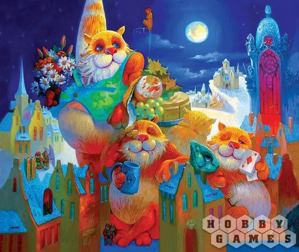 Вам предстоит собрать картину художника Сергея Адеева "Праздник полной луны". В яркое полнолуние на городской площади собрались закадычные друзья – три толстых рыжих кота. Этой ночью так хорошо и безмятежно! Но это лишь внешнее спокойствие. Начав собирать эту головоломку, вы обнаружите в деталях пазла множество жутких персонажей – призраков, ведьм, летучих мышей и прочей нечисти. Хватит ли у вас смелости завершить начатое?