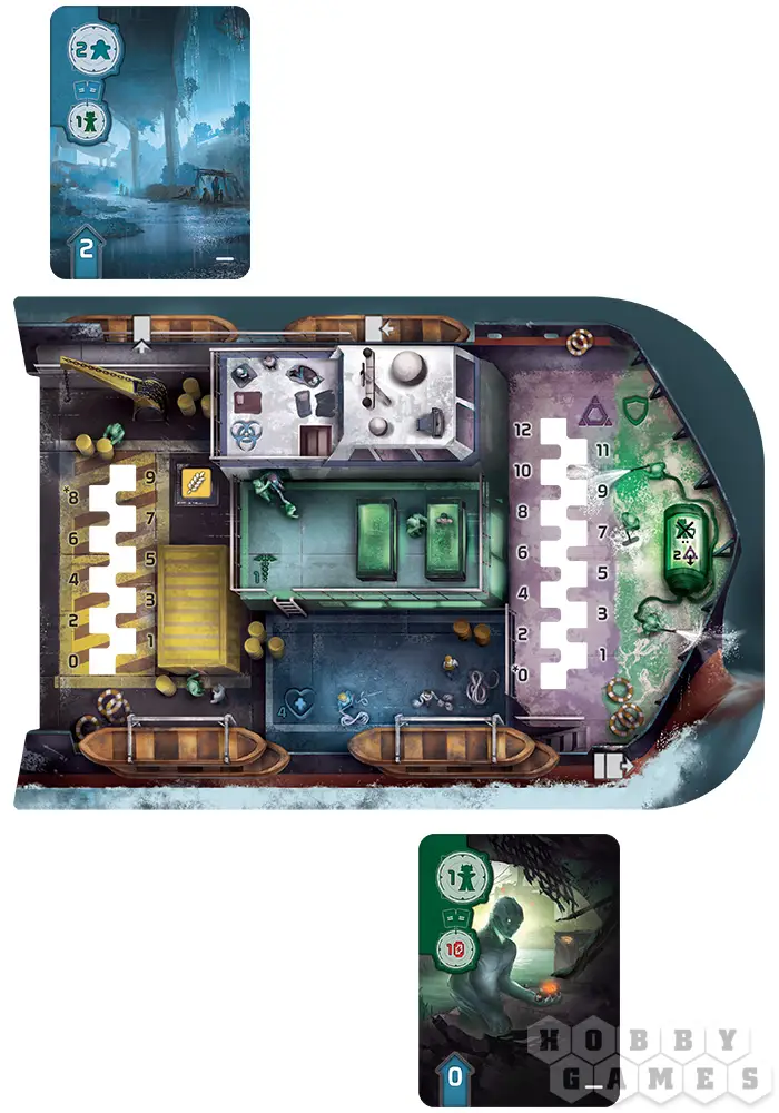 Затем наступает фаза действий, в которой игроки активируют свои карты, лежащие в зоне действий. У каждой карты своя стоимость активации, которая составляет определённое количество здоровых людей в каюте на вашем корабле. Вы можете активировать обе карты, заплатив столько людей из каюты в карантинную зону, каково суммарное значение активации обеих карт. А можете активировать только одну из двух карт, тогда перемещать людей из каюты в карантин не придётся. Во втором случае оставшаяся карта не принесёт вам никакой пользы, но зато ваши люди на корабле останутся здоровы. Также в каждом отсеке корабля есть по 3 механизма, которыми вы можете воспользоваться после розыгрыша карт только если они включены. Они приносят дополнительные ресурсы по тем же правилам, что и разыгранные карты.