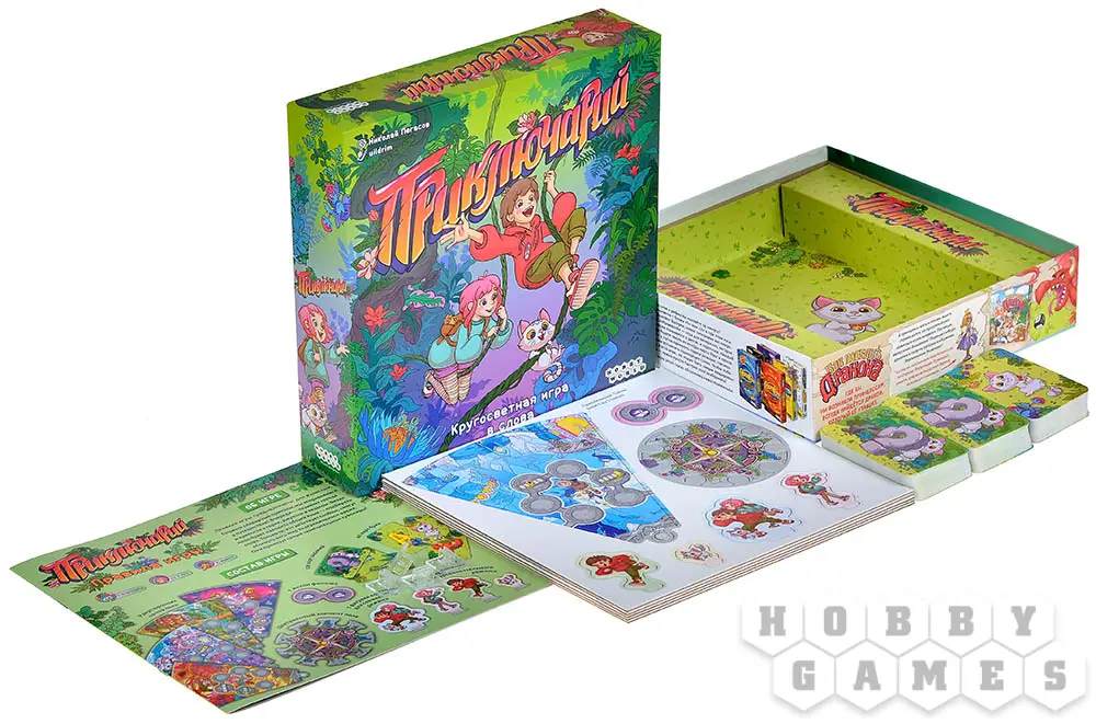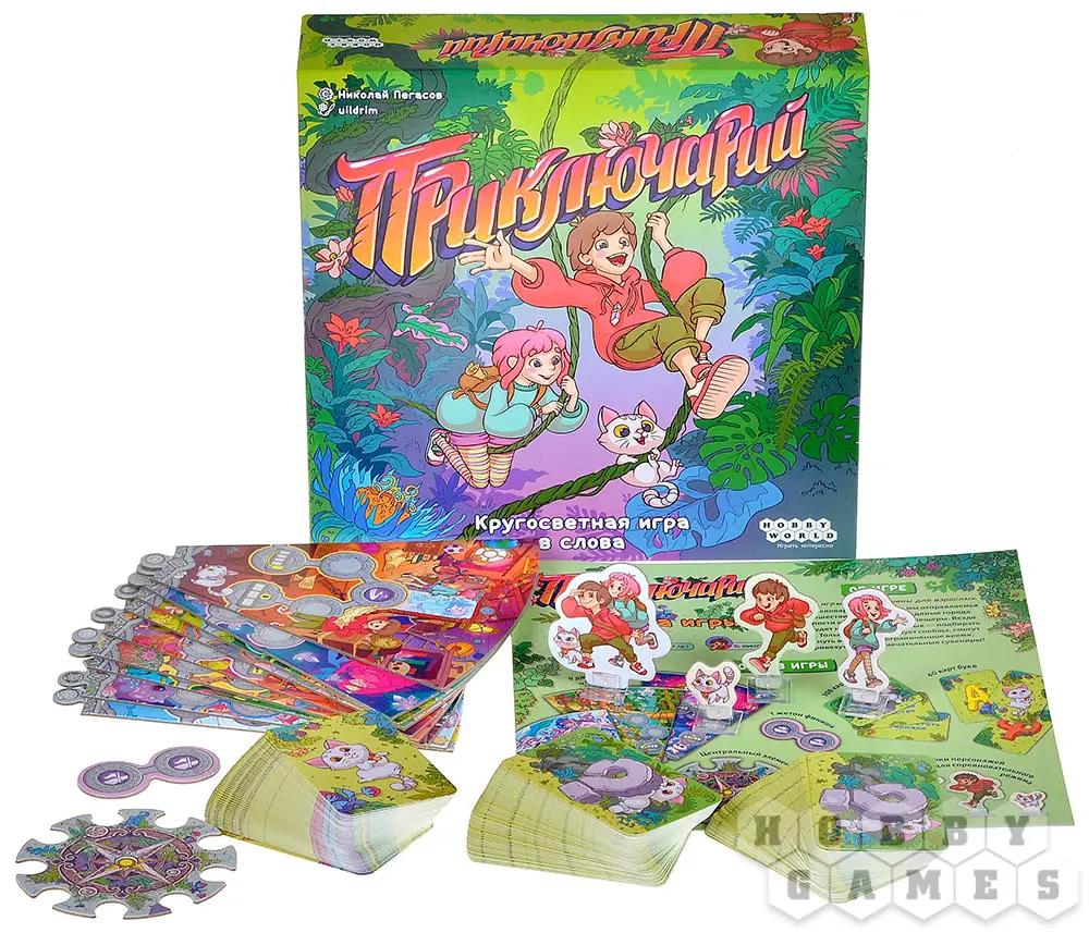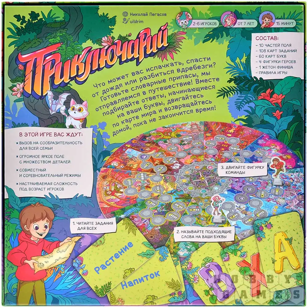 "Приключарий" – это увлекательная игра, близкий родственник "Соображария". Вы будете тянуть две карты: одна из них – карта буквы, вторая – вопроса. Сможете ответить, что начинается на букву "Ш" и способно укрыть вас от дождя? Правильно, шляпа! А что на букву "З" может разбиться на десятки мелких осколков? Ну, допустим, зеркало. В общем, вы поняли принцип. Каждый раз, когда вы даёте правильный ответ, вы продвигаетесь вперёд по красочному и детализированному полю. Можно играть командами, а можно – каждый сам за себя. Задача одинаковая – как можно быстрее преодолеть все остановки и вернуться домой, потому что, как известно, в гостях хорошо, а дома лучше. И да, к приключениям это тоже относится.