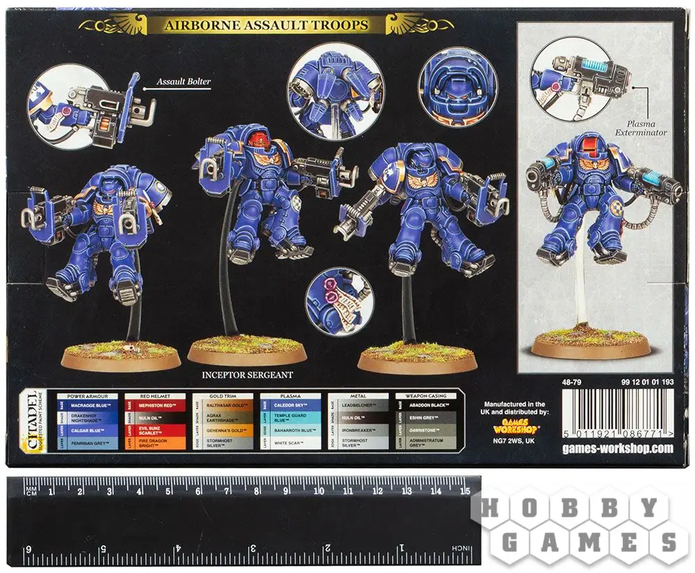 Набор содержит 117 пластиковых деталей для сборки Зачинателей Примарис, три 40-миллиметровые подставки, три 45-миллиметровые ножки, а также лист декалей Пехоты Ультрамаринов.