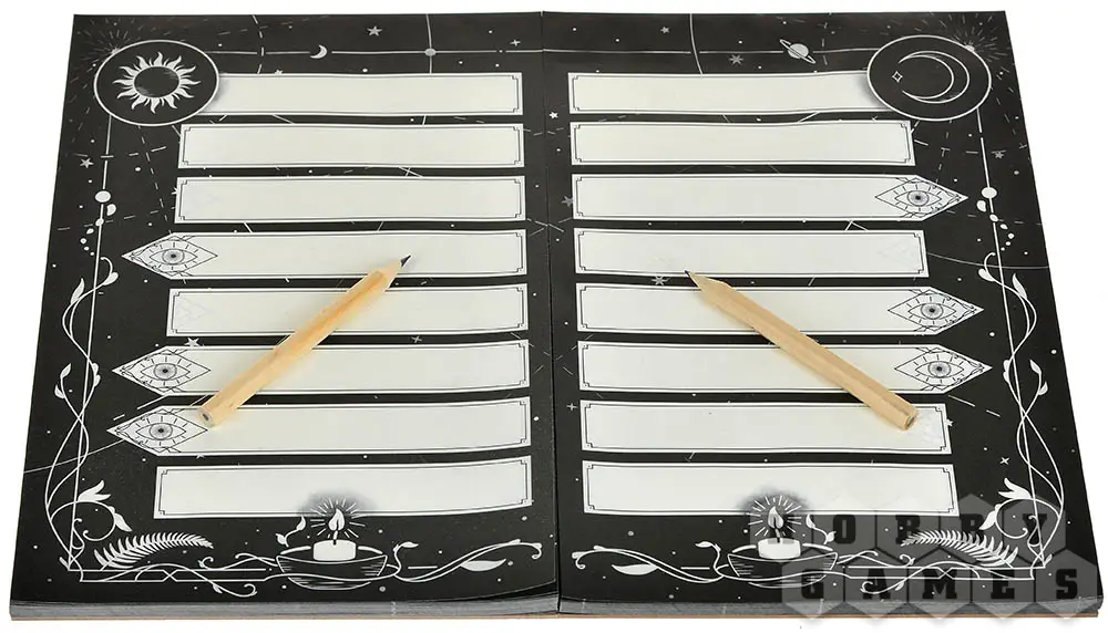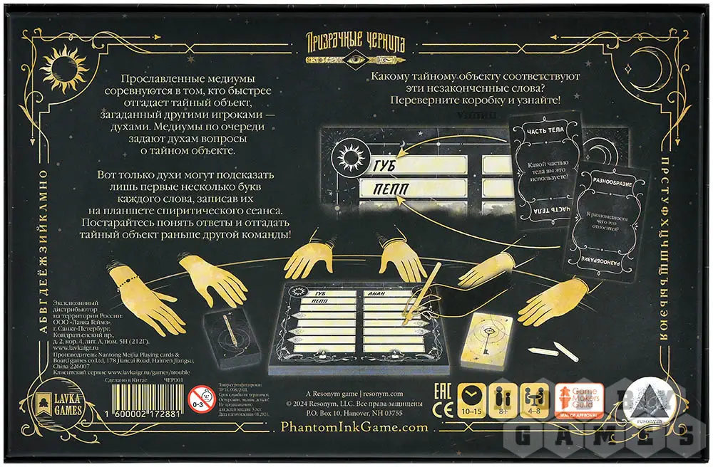 "Призрачные чернила" – это простая и увлекательная игра, в которой игроки поделятся на медиумов и духов. Задача медиумов – угадать, какой объект выбрали духи. Задача духов – с помощью подсказок этот объект описать. Коммуникация между людьми и призраками происходит через планшет спиритического сеанса. Оракулы будут через карты-вопросы уточнять у духов детали, описывающие загаданный предмет, а духи – побуквенно им отвечать, причём ответ может прерваться на любой букве, если команда решит, что ей этого достаточно. Игра продолжается до момента, пока кто-то из медиумов не отгадает выбранный объект.