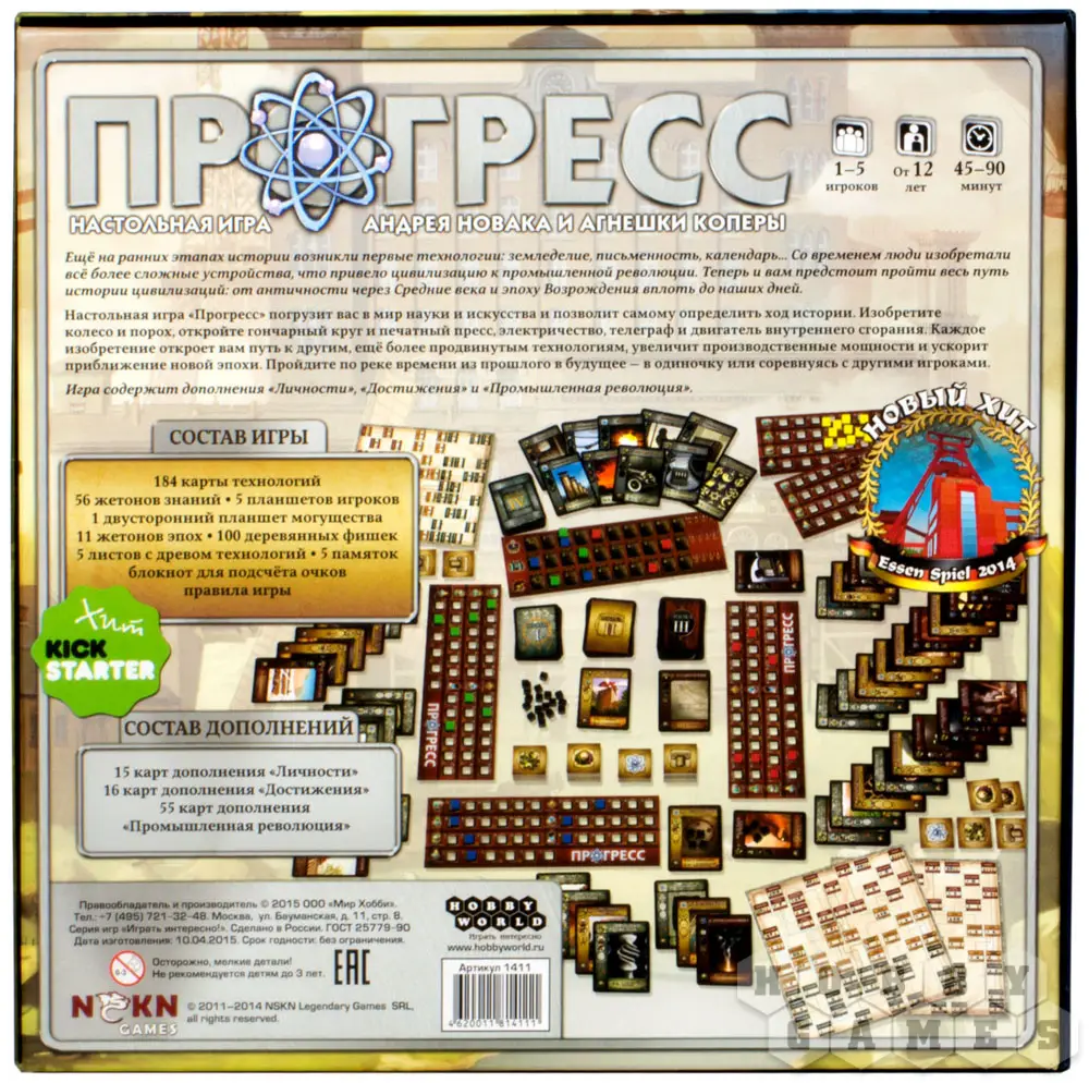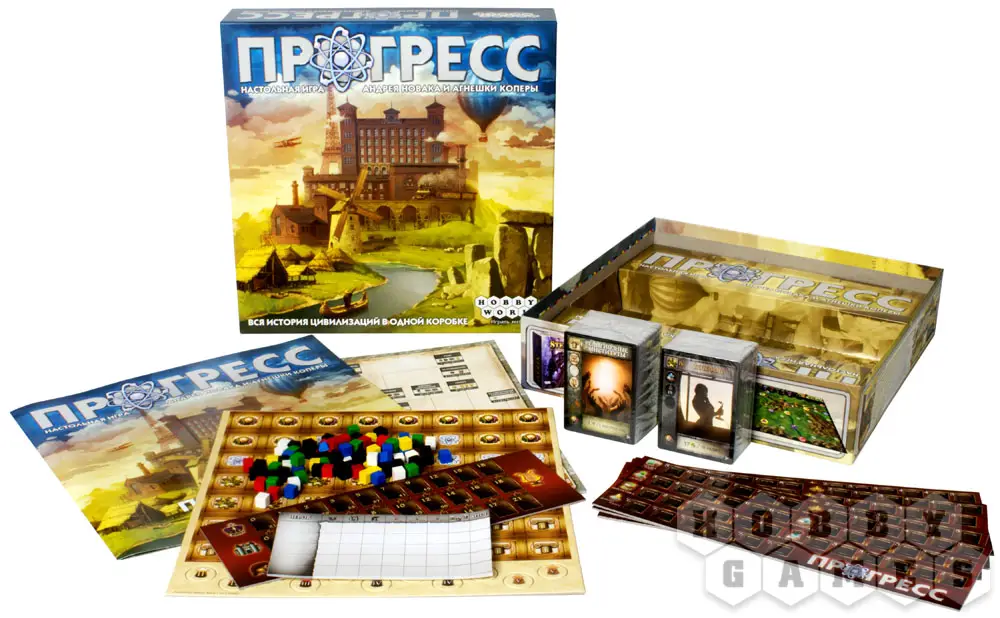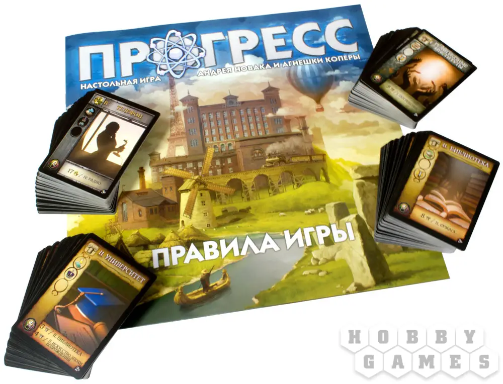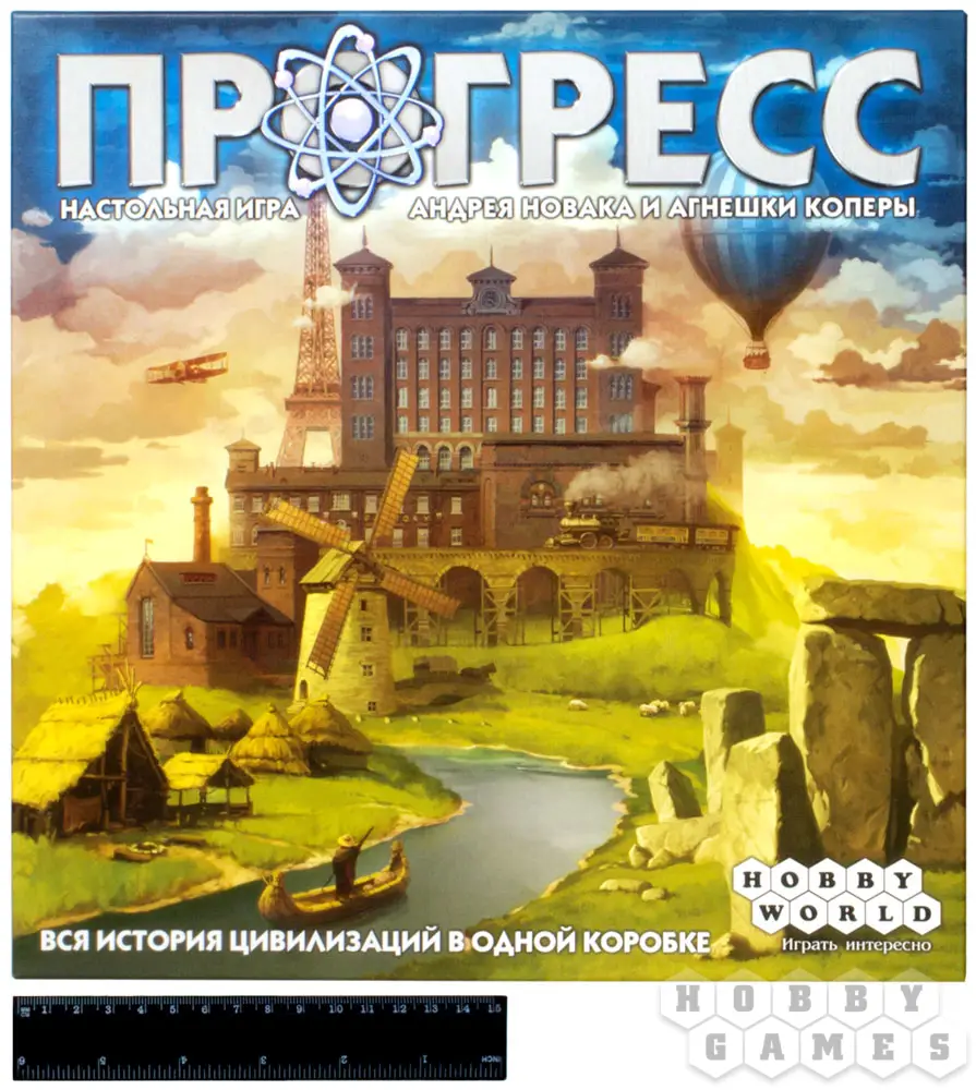 В настольной игре «Прогресс» Вы сами сможете определить ход истории, погрузившись в мир искусства и науки. Откройте порох и колесо, изобретите печатный пресс и гончарный круг, телеграф, электричество и двигатель внутреннего сгорания. Каждое новое открытие проложит Вам путь к другим, ещё более продвинутым изобретениям, увеличит производственные мощности и ускорит явление новой эпохи. Станьте творцом истории, пройдите от ее истоков до самого устья - в одиночку, или же соревнуясь с другими игроками.