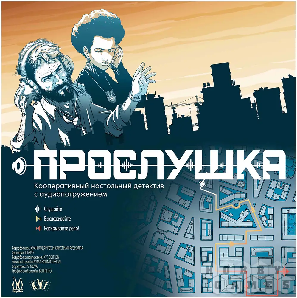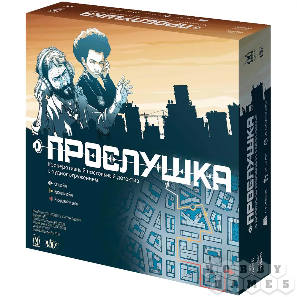 "Прослушка" – это кооперативный настольный детектив, в которой вы и ваши друзья станете следователями особого аудиоотряда. Совместными усилиями вам предстоит провести 15 уникальных расследований, входящих в данную коробку, чтобы вычислить преступников. Но вы сможете раскрывать преступления и в одиночку, если ваши напарники уехали в офис и оставили в отделе одного.