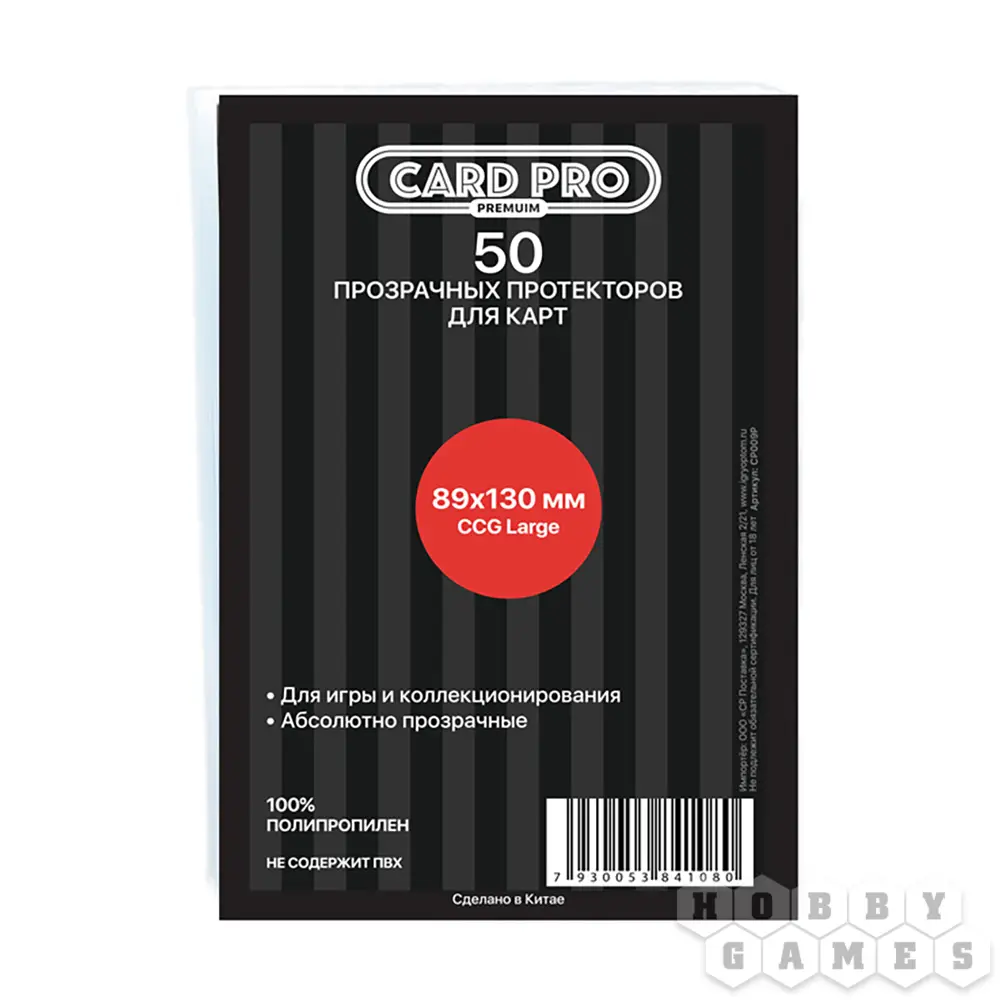 Упаковка из 50 прозрачных протекторов Card-Pro из тонкого полипропилена размером 89x130 мм. Протекторы подходят для больших размеров карт Magic: The Gathering, в первую очередь, для карт Planechase и Arch Enemy, а также для некоторых промокарт.