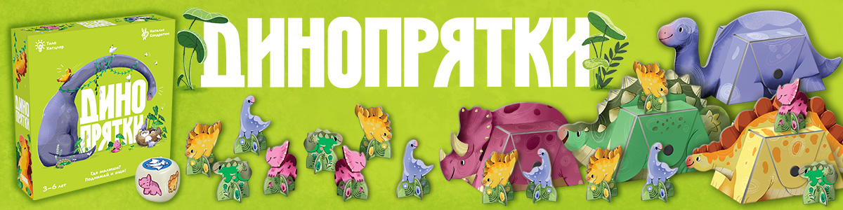 Сыграйте в прятки с динозаврами! Кидайте кубик и ищите детёнышей трицератопса, бронтозавра, анкилозавра и стегозавра. Запомнили, где они спрятались? Смотрите под большими ящерами и проверяйте догадки. Но остерегайтесь птеродактиля и тираннозавра. Найдите больше всех динозавриков и станьте победителем динопряток!