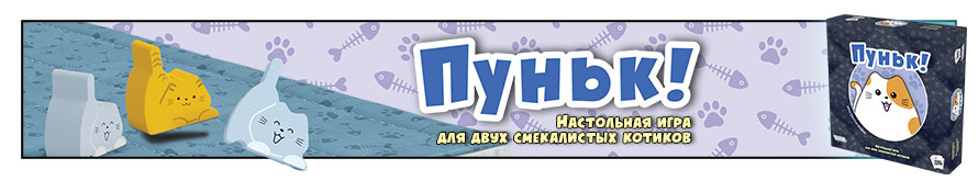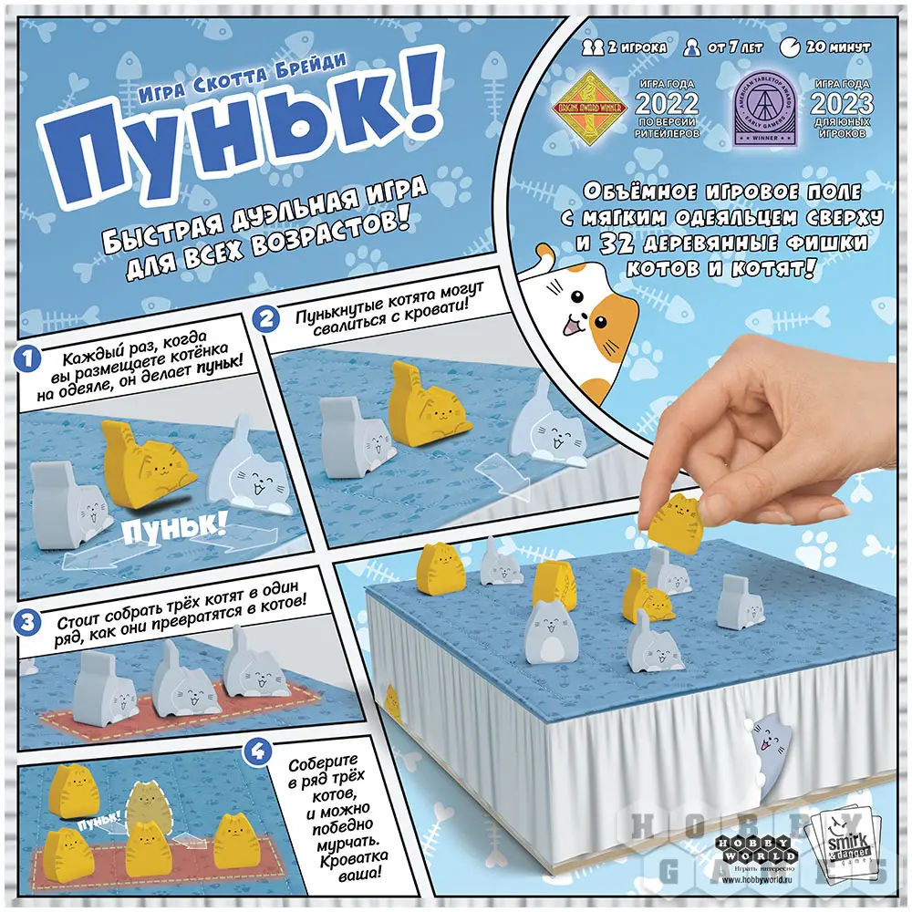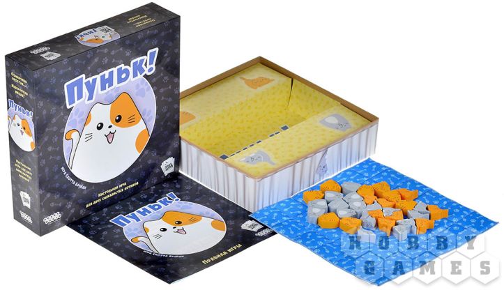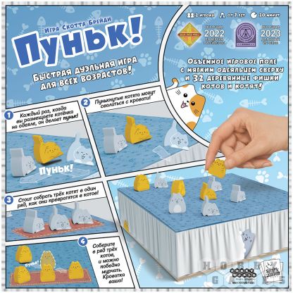 "Пуньк!" – это очаровательная дуэльная игра, которая покорит и детей, и взрослых. В коробке вас ждёт уютное игровое поле в виде стёганого одеяла и объёмные фигурки котят и котов. Главная цель – первым собрать ряд из трёх взрослых котов или разместить их всех ваших на мягком одеялке. Но будьте готовы к постоянным сдвигам и неожиданностям – каждый ход меняет расстановку сил! Игра сочетает простые правила с глубокой стратегией и дарит море веселья.