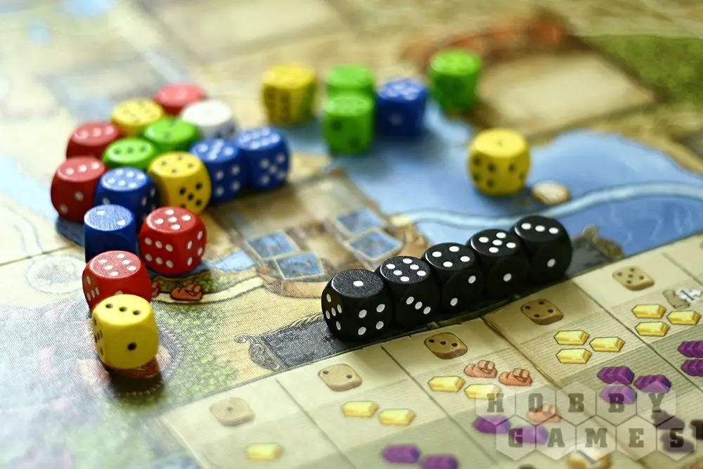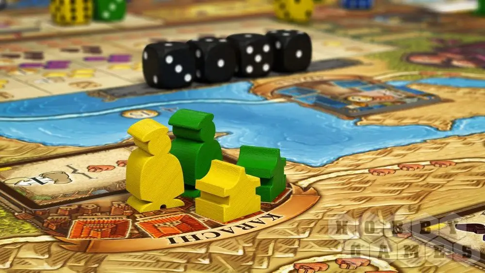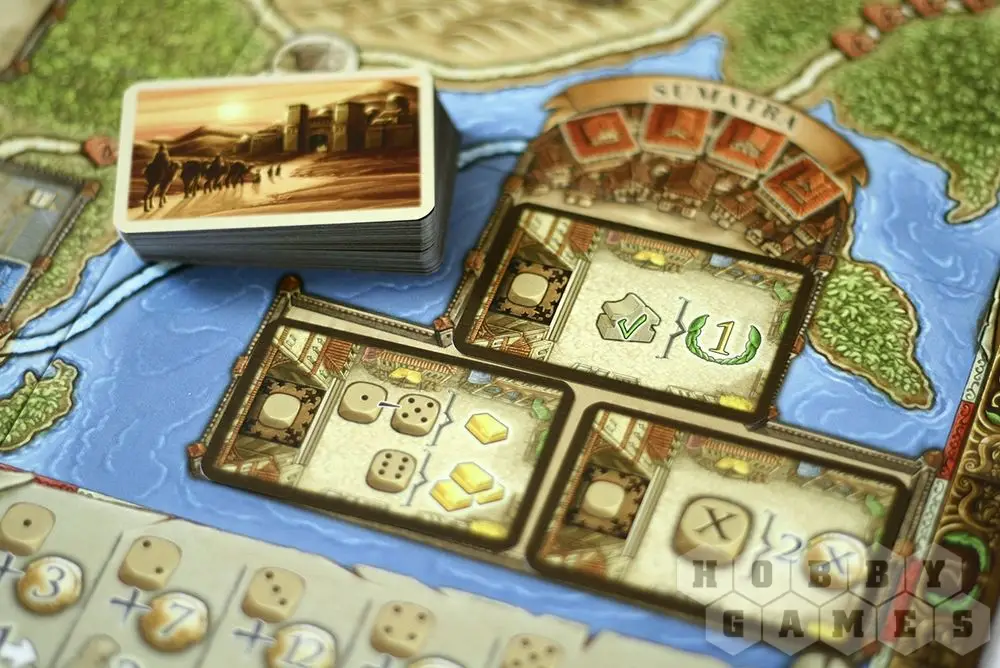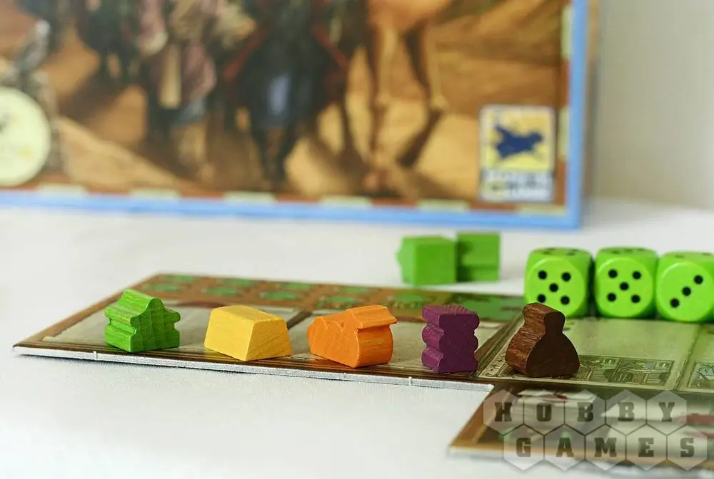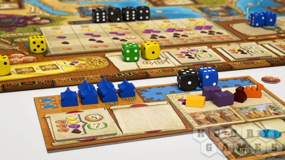 Изюминкой игры являются также кубики действий. В начале каждого раунда игроки бросают кубики и распределяют их по специальному полю действий, соответственно выпавшему результату. А действия бывают самые разные. Вы можете взять 5 монет, или получить необходимые товары. Можно даже заручиться покровительством хана, что принесет вам верблюда и любой товар по выбору. И конечно же, выбрав своим действием путешествие, вы сможете переместить свою фигурку по глобальной карте, ведь остановившись в новом городе, вы сможете открыть там свое торговое представительство, то есть – пост.