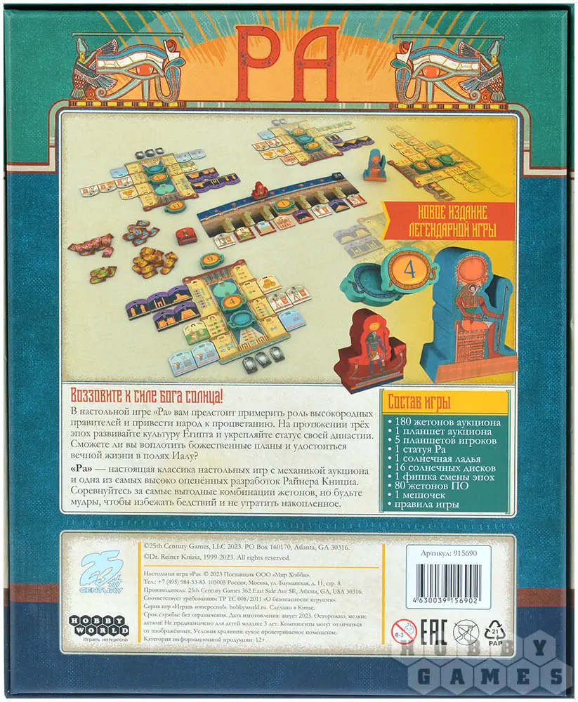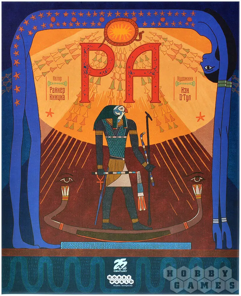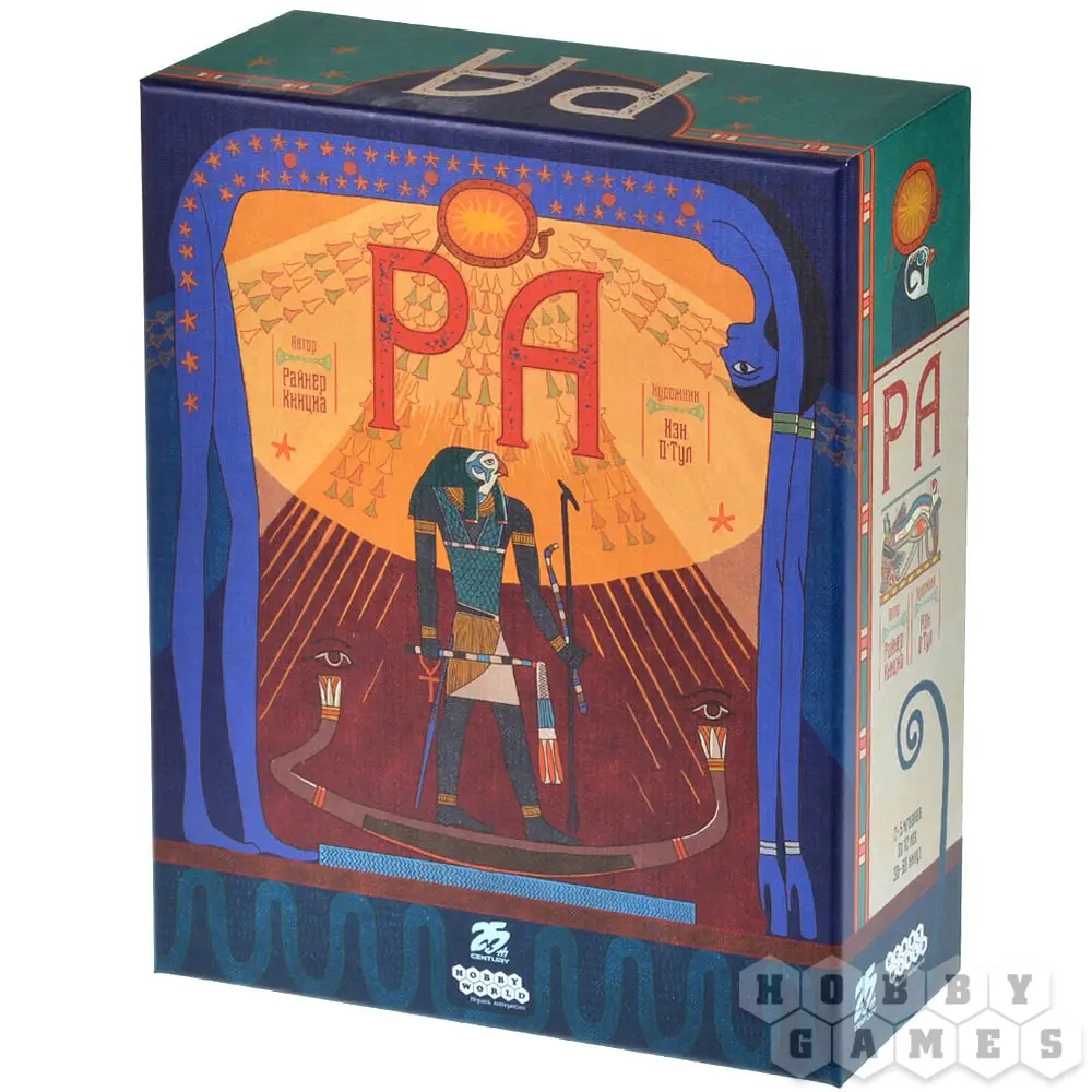 В настольной игре "Ра" вам предстоит примерить на себя роль высокородных правителей Древнего Египта, посвятивших свою жизнь и правление сохранению "ма’ат". На протяжении трёх эпох развивайте культуру Египта и укрепляйте статус своей династии, следуя воле богов. Время вашего царствования сильно ограничено, поэтому вам предстоит с умом выбирать, как именно вы станете проводить свои дни на этой земле. В конце пути вам останется только надеяться, что вы всё же сумели заслужить благосклонность богов и вечный покой посреди безмятежных тростниковых полей Иалу.