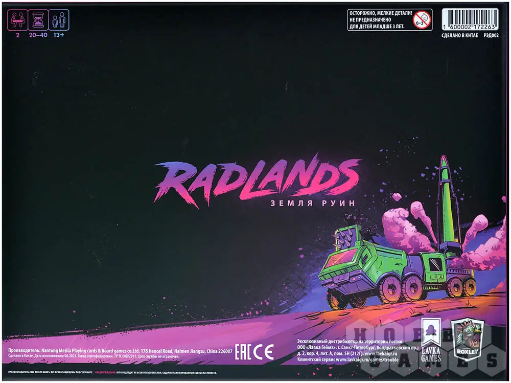 Постапокалиптический хаос... Единственная цель – выживание! В дуэльной карточной игре "Radlands. Земля руин" каждый игрок становится лидером группы выживших, которые отчаянно охраняют свои три лагеря. Вам предстоит возглавить своё племя в жестокой схватке за драгоценный ресурс – воду, ставшую символом жизни в этом разрушенном мире.