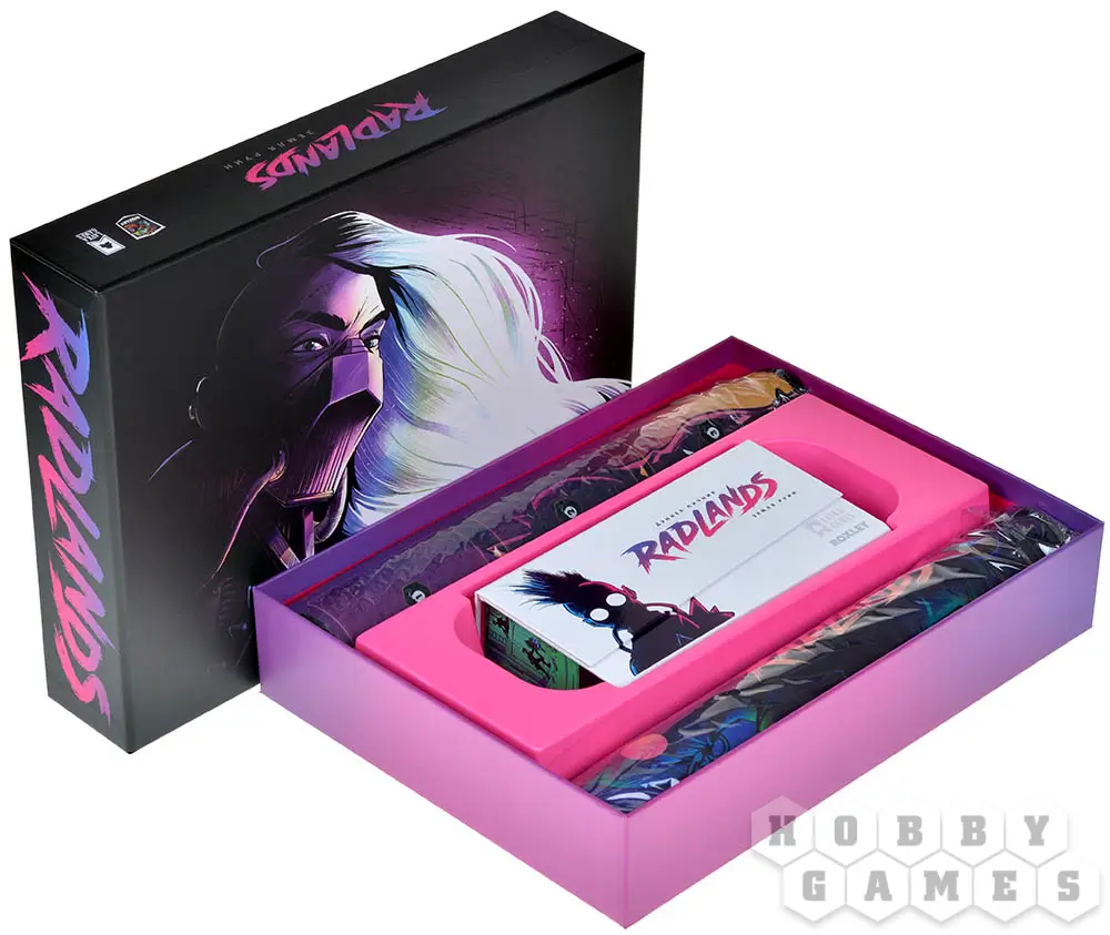 В версии игры "Radlands: Земля руин. Супер Делюкс" вас ждёт большая эффеткная коробка, идеально сочетающая в себе функциональность, презентабельность и практичность. Эта версия игры отлично подойдёт любителям стратегии и постапокалиптического жанра в качестве подарка. Внутри все та же компактная складная коробка с магнитным замком, пластиковые карты, тяжёлые пластиковые жетоны воды. Но это не всё! Также вы найдёте два неопреновых коврика, которые создают идеальную игровую поверхность, и пластиковый трей, заботливо хранящий все элементы игры.