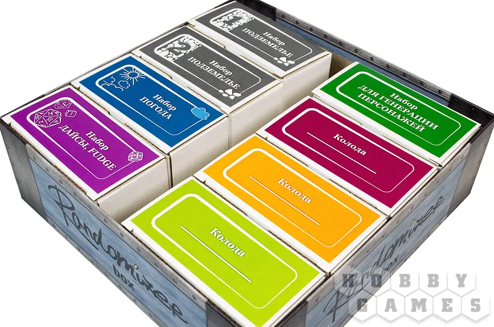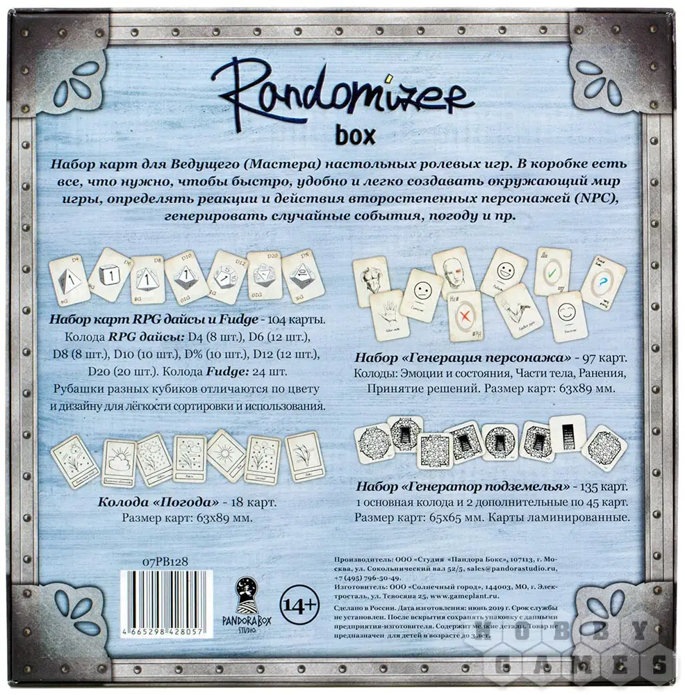 Вы держите в руках уникальную коробку с наборами карт для Ведущего (Мастера) настольных ролевых игр – Рандомайзер Бокс (Randomizer Box). С помощью этих наборов Ведущий (Мастер) может легко и быстро создавать на ходу или заранее окружающий мир и персонажей в игре, определять реакции, мотивы и действия второстепенных персонажей (NPC), генерировать случайные события, погоду, подземелья и тому подобное.