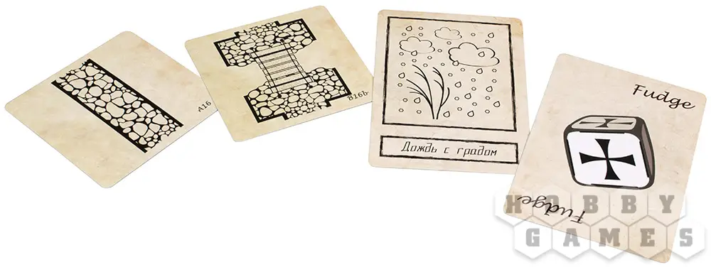 В центре коробки, между коробами, имеется место для маркеров и других нужных мастеру вещей. Короба отрываются сверху так, что их не нужно вынимать из общей коробки, чтобы достать или убрать карты (просто снимите с общей коробки крышку!).