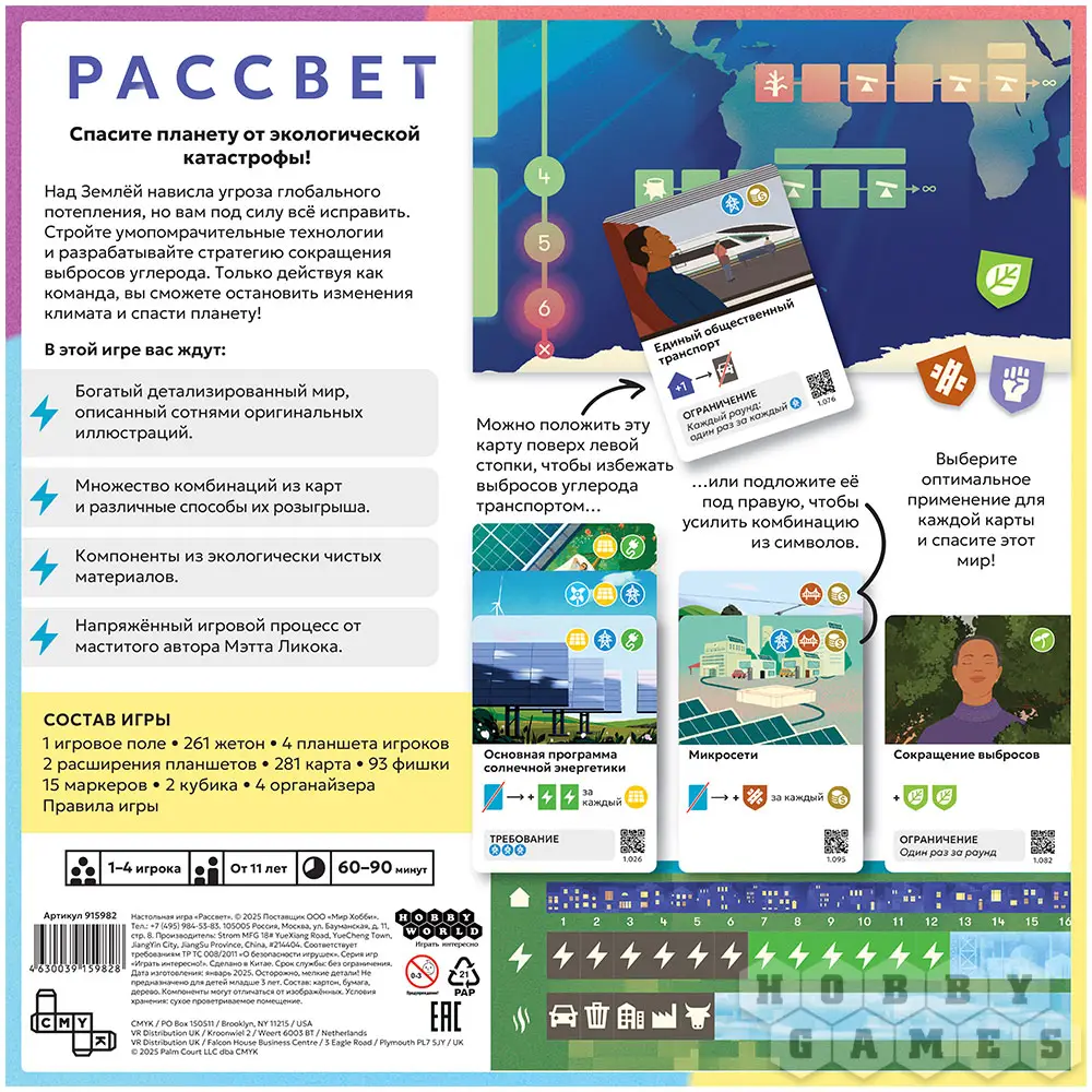 "Рассвет" – кооперативная стратегическая игра от Мэтта Ликока, создателя "Пандемии", в которой вы будете управлять мировыми державами и стремиться спасти планету от климатической катастрофы. От лица Китая, Европы, США или мирового большинства вы будете преследовать главную цель – сократить углеродные выбросы, прежде чем Земля перегреется или города охватит кризис. Игра очаровывает потрясающими иллюстрациями и компонентами из – разумеется! – экологически чистых материалов. Вас ждут мощная колода карт и сложные решения, где важно не только думать на два шага вперёд, но и помогать друг другу.