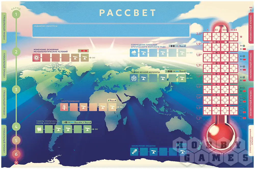 Партия состоит из последовательных раундов, где игроки действуют одновременно, проходя пять ключевых этапов. В глобальной фазе вы вместе решаете, какие проекты реализовать, и обсуждаете надвигающийся кризис. Затем следует локальная фаза, в которой каждый управляет своей державой: разыгрывает карты, создаёт устойчивую инфраструктуру, внедряет чистую энергию и даже помогает союзникам – ведь цели у вас общие.