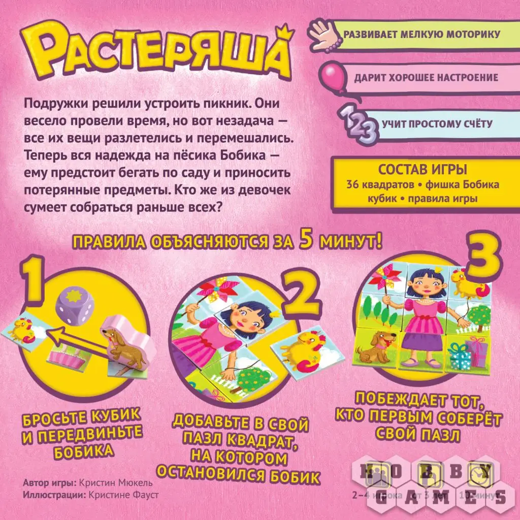 "Растеряша" – это детская настольная игра для самых маленьких. Рассчитана она прежде всего на девочек, а играть в неё можно уже с трёх лёт. Игра отлично развивает мелкую моторику, а также учит простейшему счёту и пространственному мышлению. Вся игра оформлена в нежных розовых цветах, что точно понравится маленьким принцесскам!