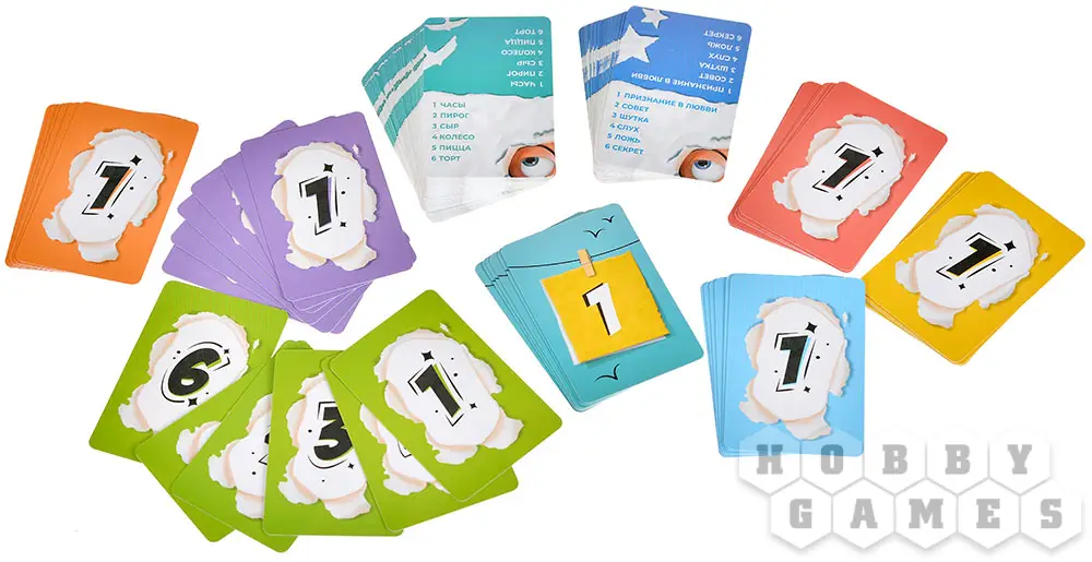 Осмысление. Все шедевры представляются на суд зрителей. Теперь задача каждого – внимательно изучить творения соперников и попытаться разгадать их замысел. Игроки выкладывают свои карточки-догадки с предполагаемым номером идеи рубашкой вверх рядом с каждым из холстов.