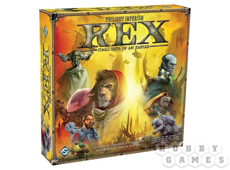 Настольная игра Rex представляет собой переосмысленную версию настольной игры Dune 1979-го года выпуска во вселенной Twilight Imperium от FFG. Это игра переговоров, предательств и войн; в которой от 3-х до 6-ти игроков смогут взять под свой контроль великие межзвёздные цивилизации, конкурирующие за господство над имперским городом. Действие игры происходит за 3000 лет до событий Twilight Imprerium – Rex рассказывает о последних днях империи Lazax, и представляет игрокам абсолютно непохожие друг на друга расовые способности и захватывающие возможности для дипломатии, хитростей, и тактического мастерства.