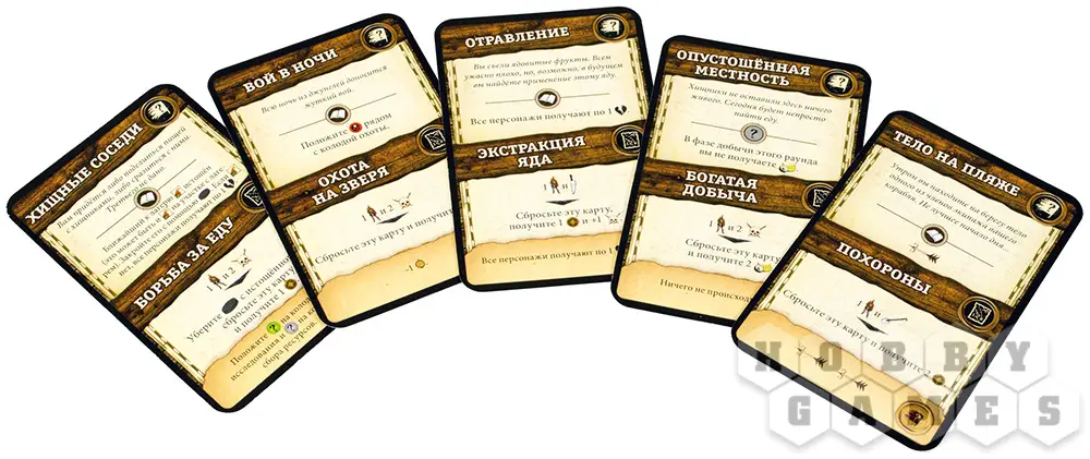 Фаза ночи – в эту фазу можно перевести дух, перенести лагерь на другой участок острова. Все персонажи должны поесть и поспать