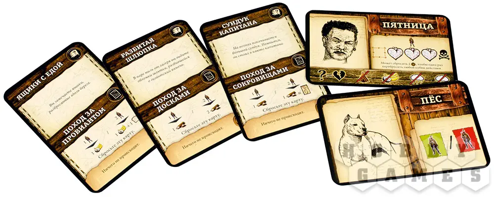 В "Робинзона" можно играть и вдвоём, а можно даже одному. В этом случае правилами игры предусмотрены специальные помощники – Пятница и верный пёс. А ещё игра предлагает усложнённые и упрощённые варианты игры, так что вы сможете настроить сложность под себя.