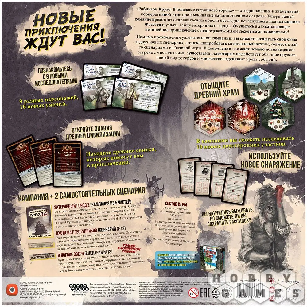"Робинзон Крузо: Приключения на таинственном острове. Вторая редакция" – это кооперативная настольная игра, в которой одному игроку или команде до четырёх человек предстоит превозмогать тяжести жизни на необитаемом острове, всеми силами выживать, разгадывать тайны и пройти все семь сценариев, каждый из которых предложит уникальный игровой процесс. Сценарии можно объединить в большое приключение-кампанию, тогда ваше путешествие в мир игры станет ещё увлекательнее!
