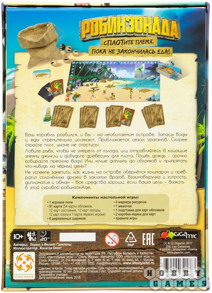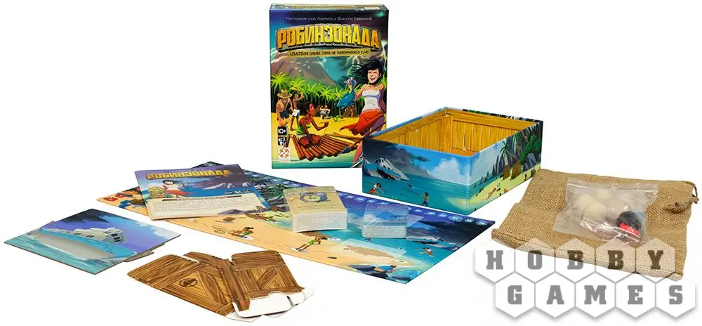Настольная игра "РобинзонАда" предлагает компании игроков переместиться на необитаемый остров и испытать себя. Попытайтесь выжить, избегая укусов ядовитых змей, найти воду и пропитание, найти общий язык друг с другом, чтобы всем вместе, сообща построить большой деревянный плот и вырваться с этого острова, который изначально показался вам райским, иначе надвигающийся ураган не оставит никого в живых!
