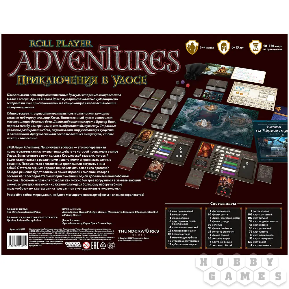 "Roll Player Adventures: Приключения в Улосе" — это кооперативная повествовательная настольная игра, в которой вам предстоит спасти мир Улоса! В роли солдат Королевской гвардии игроки будут принимать решения, от которых зависят судьбы как отдельных людей, так и целых городов – а то и стран!