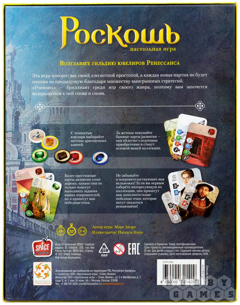 Настольная игра "Роскошь" позволит Вам ощутить себя настоящим ювелиром, добывая драгоценные камни, развивая и расширяя своё производство. Ну, а в конце Вас ждёт всеобщее признание как зажиточной и влиятельной знати эпохи Ренессанса.
