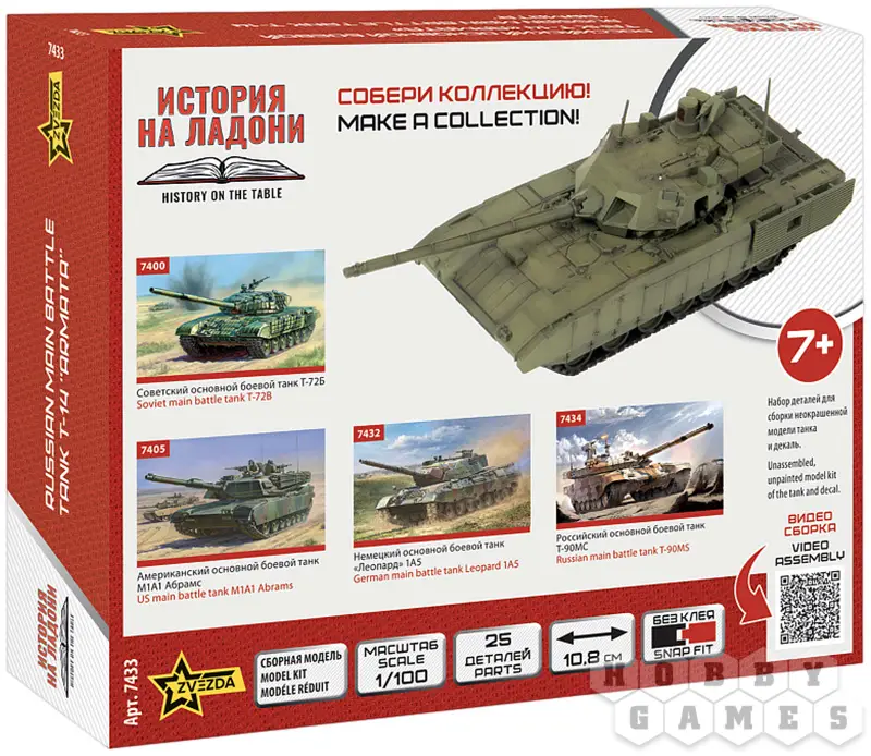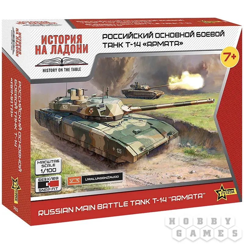 Основной боевой танк Т-14 "Армата" относится к перспективному поколению российской бронетехники. Принципиальным отличием машины является размещение всего экипажа в специальной изолированной бронекапсуле, встроенной в корпус, в то время как башенная часть является необитаемой. Машина оснащена комплексом средств обороны нового поколения, включающим систему активной защиты "Афганит" и динамическую броню "Малахит". Вооружение представлено мощной 125-мм гладкоствольной пушкой, а также пулемётом калибра 12,7 мм марки "Корд".