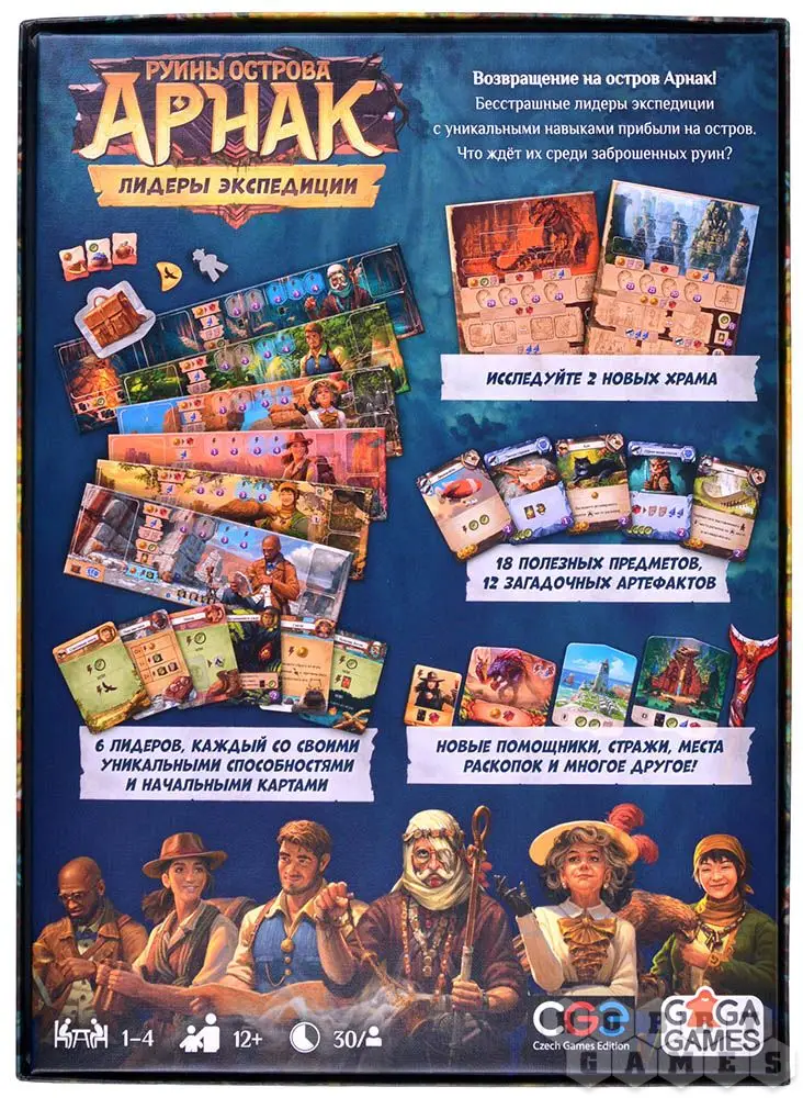 Дополнение "Лидеры экспедиции" для настольной приключенческой игры "Руины острова Арнак" добавляет 6 новых лидеров, под чутким руководством которых вы сможете докопаться до всех тайн острова: