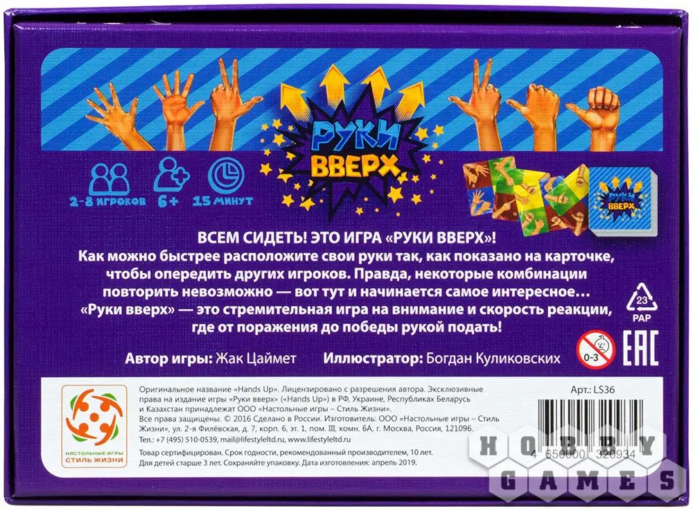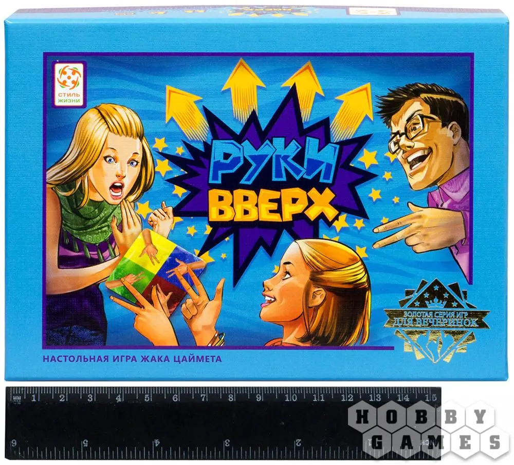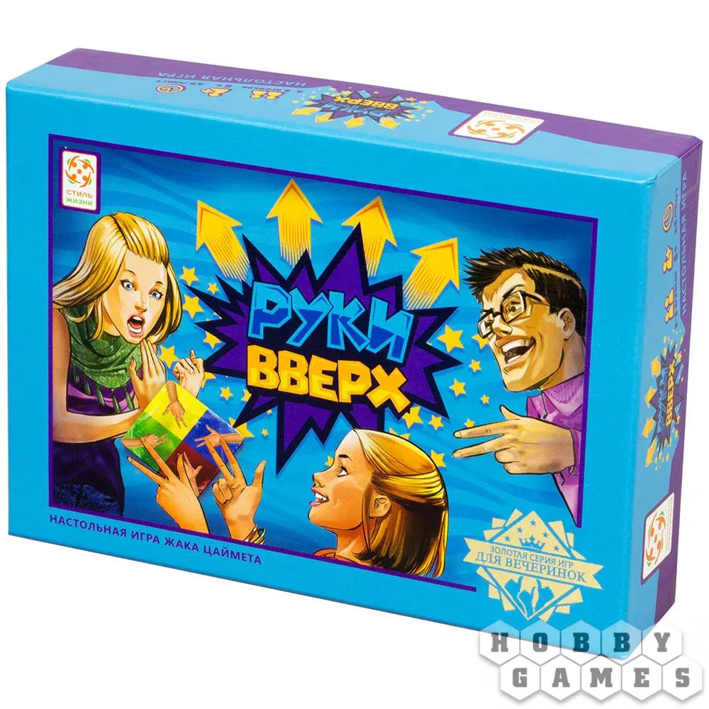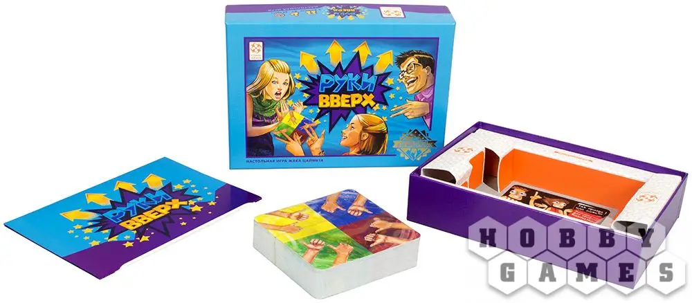 В коробке с игрой "Руки вверх" вы найдёте колоду ярких квадратных карт, которые тщательно перемешиваются и выкладываются в центр стола. Верхняя карта переворачивается, и игроки стараются показать руки таким образом, как указано на карте. Тот, кто справился с этим заданием позднее остальных, забирает эту карточку в качестве штрафного очка и переворачивает верхнюю карту в следующем раунде.