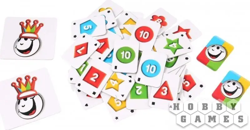 В коробке с игрой Вас ждут 44 жетона, на лицевой стороне которых изображены числа от 1 до 10, два джокера и два больших жетона с королём, а также чёрный тканевый мешочек.