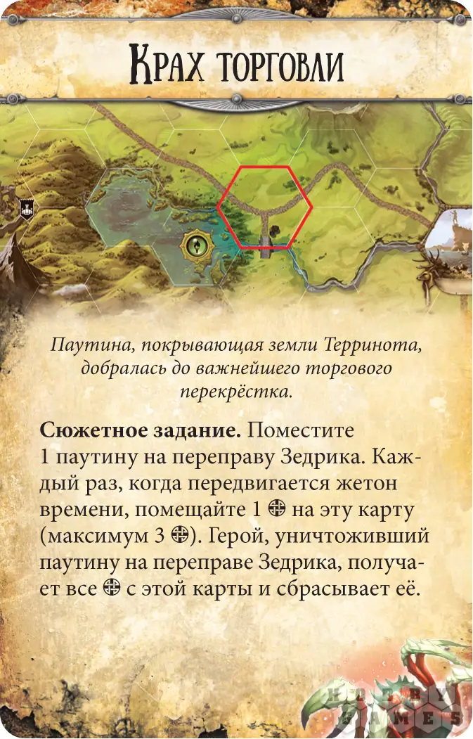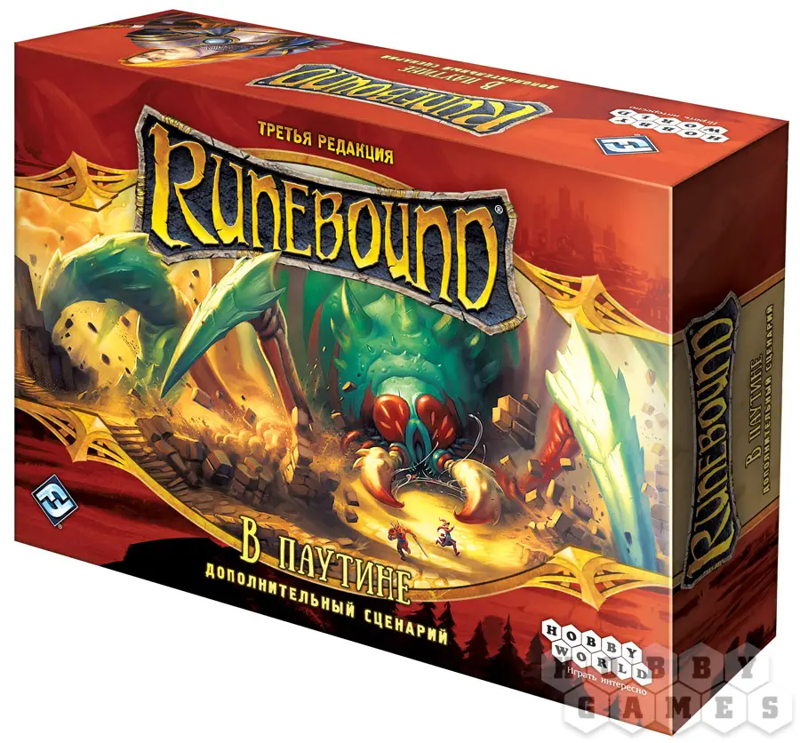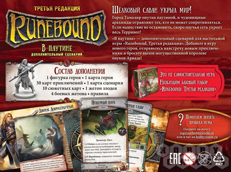 «В паутине» — дополнительный сценарий для настольной игры «Runebound. Третья редакция». Добавьте в игру нового героя, отправьтесь навстречу новым приключениям и бросьте вызов могущественной королеве пауков Ариаде!