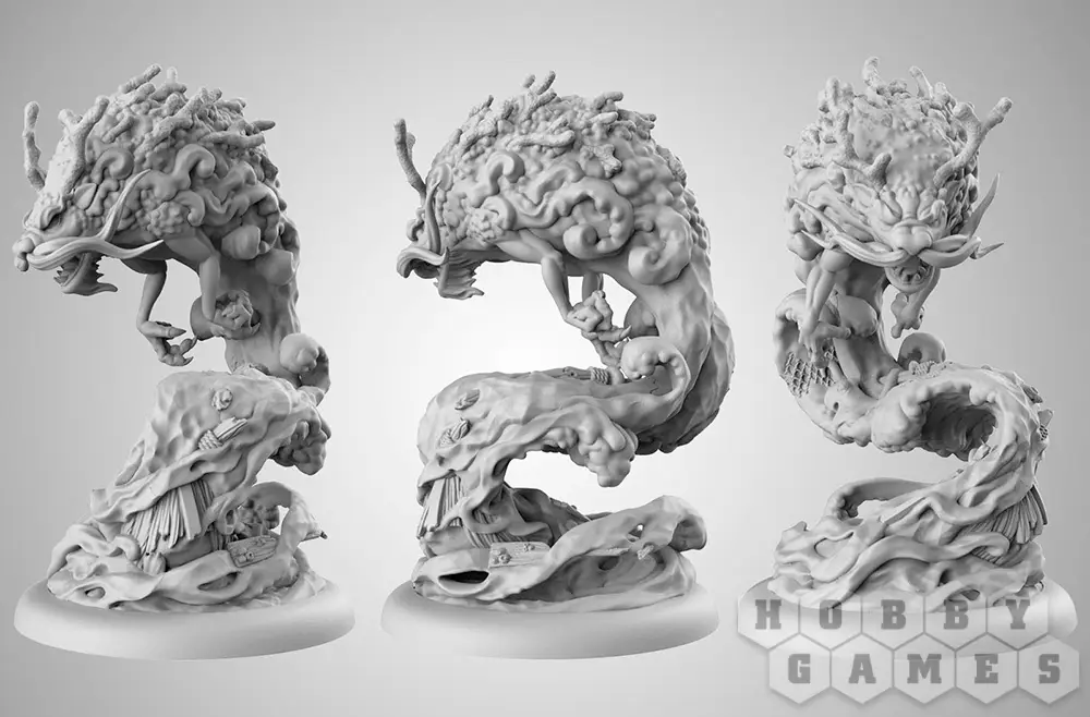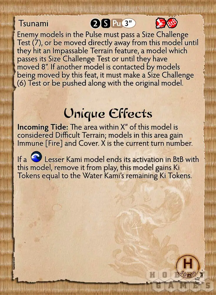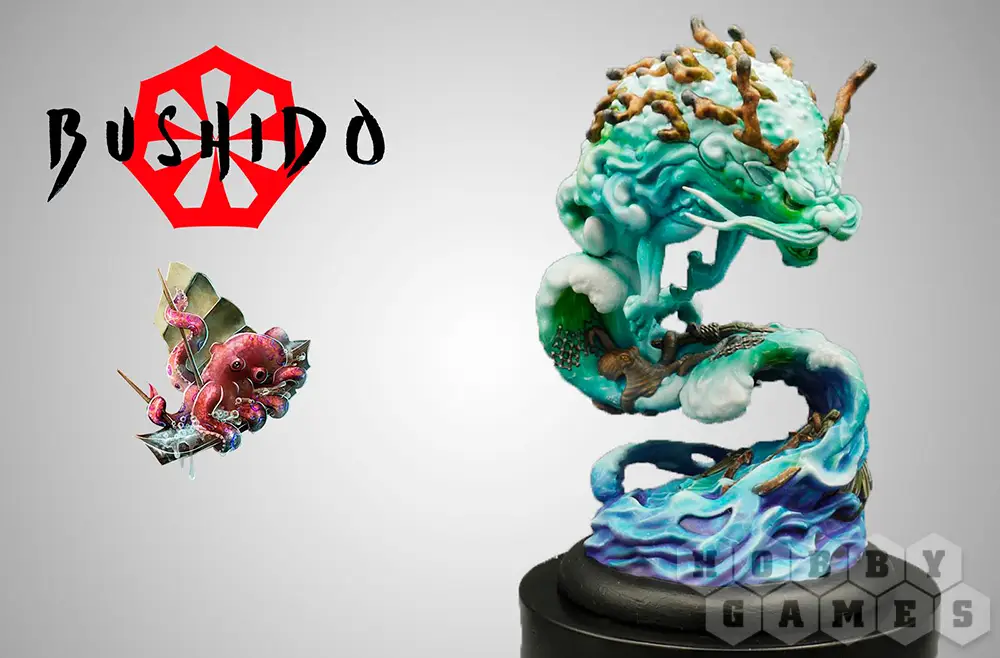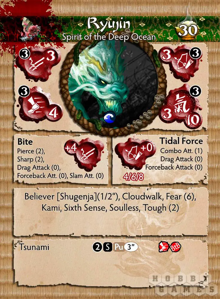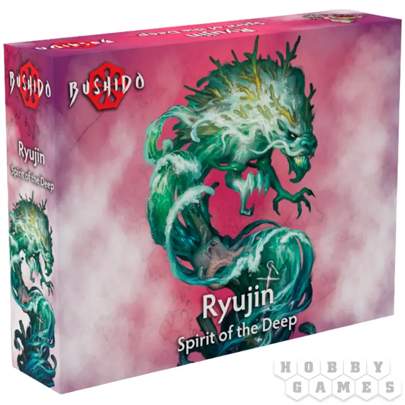 Ryujin – Spirit of the Deep Ocean, один из самых могущественных Kami на островах Jwar. Ходят слухи, что его появление вызвало цунами, опустошившее регион. Все меньшие водные Kami находятся в его подчинении и в некотором смысле являются его частью. Морские ведьмы Jung помогли обрести ему форму огромного змея, и он благословил их своей помощью. Самая большая модель Bushido вас не разочарует! Благодаря своим способностям Tsunami и Tide Ryujin может повлиять на игру, даже не совершая атаки. Но у него также есть мощные способности ближнего и дальнего боя. Наконец, у него есть способность Believer для моделей Miyakomo, делающая их навыки Ki значительно более эффективными.