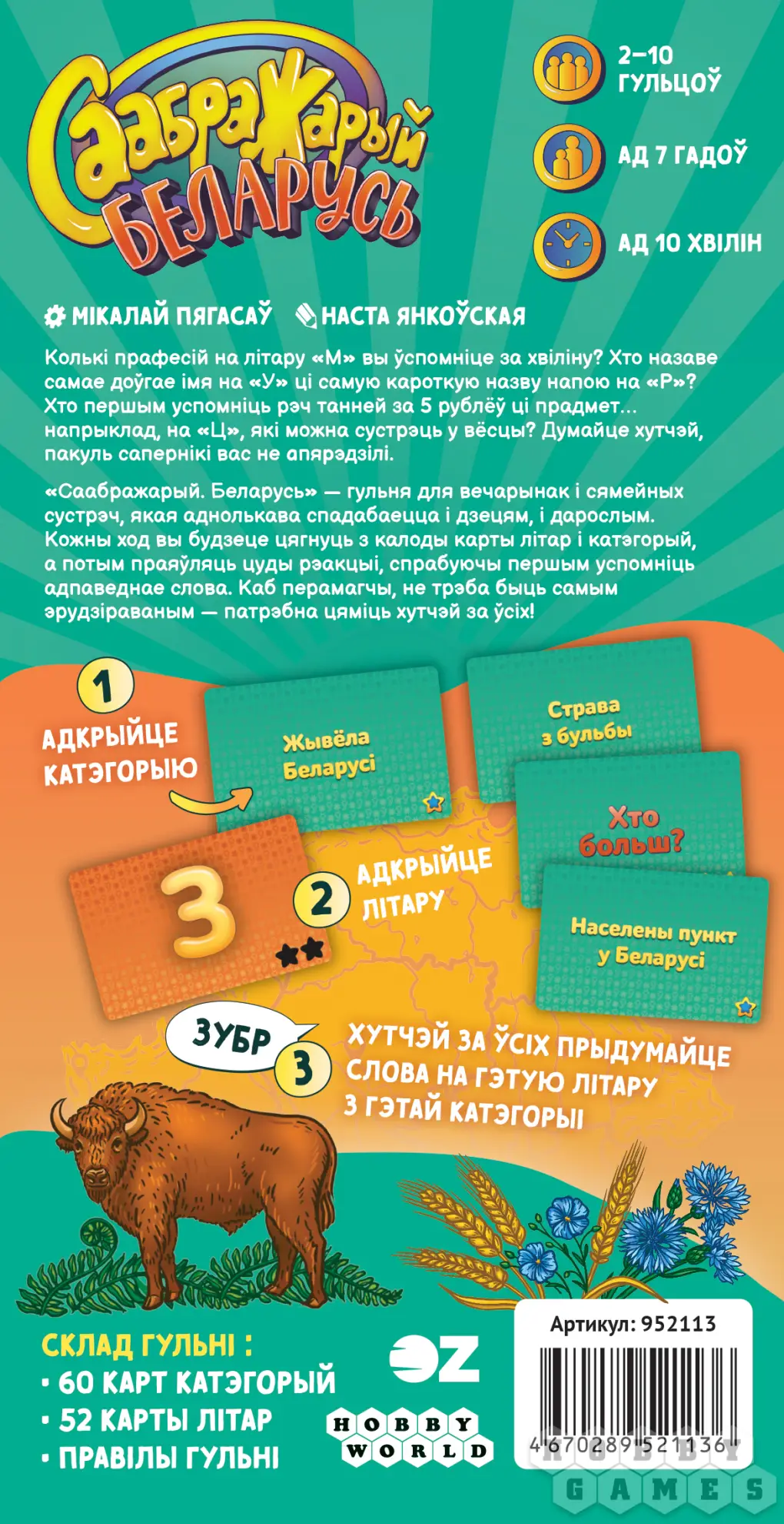 "Саабражарый. Беларусь" – гульня для вечарынак і сямейных сустрэч, якая аднолькава спадабаецца і дзецям, і дарослым. Кожны ход вы будзеце цягнуць з калоды карты літар і катэгорый, а потым праяўляць цуды рэакцыі, спрабуючы першым успомніць адпаведнае слова. Каб перамагчы, не трэба быць самым эрудзіраваным – патрэбна цяміць хутчэй за ўсіх!