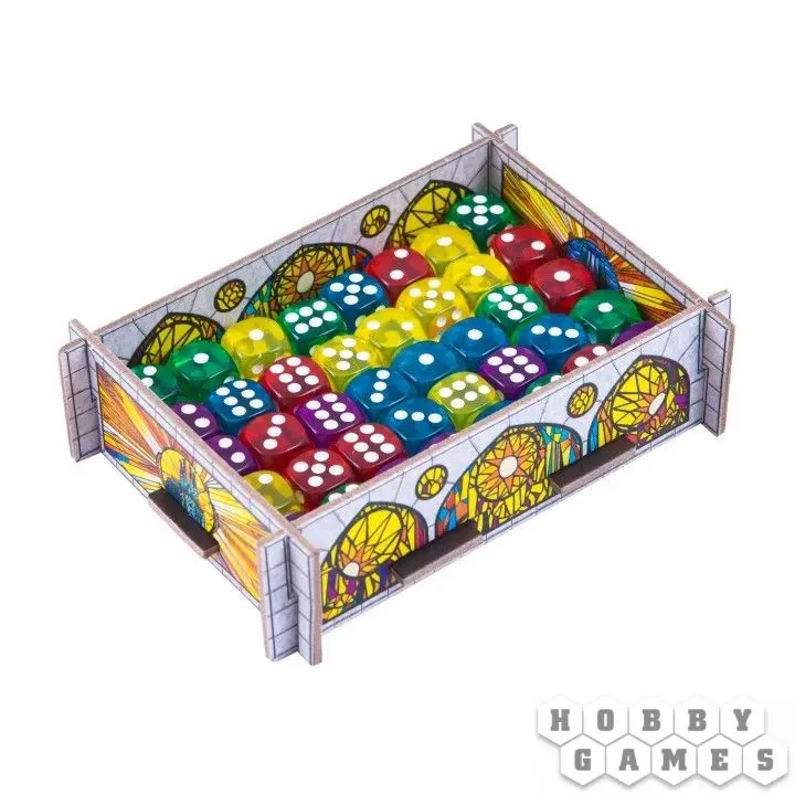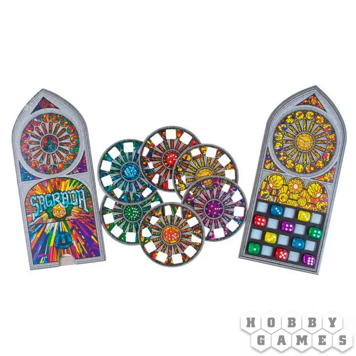 "Саграда. Дополнение для 5-6 игроков" предлагает разделить удовольствие от базовой версии впятером и даже вшестером! В коробке с дополнением вы найдёте новые витражи, инструменты, а также карты личных целей, которые, к слову, добавляются в игровой процесс только с шестью участниками. Чтобы ускорить игровой драфт, используйте новые розы кубиков. Плюс ко всему вы найдёте два маркера очков, ещё 40 прозрачных кубиков, а также коробочку для них.